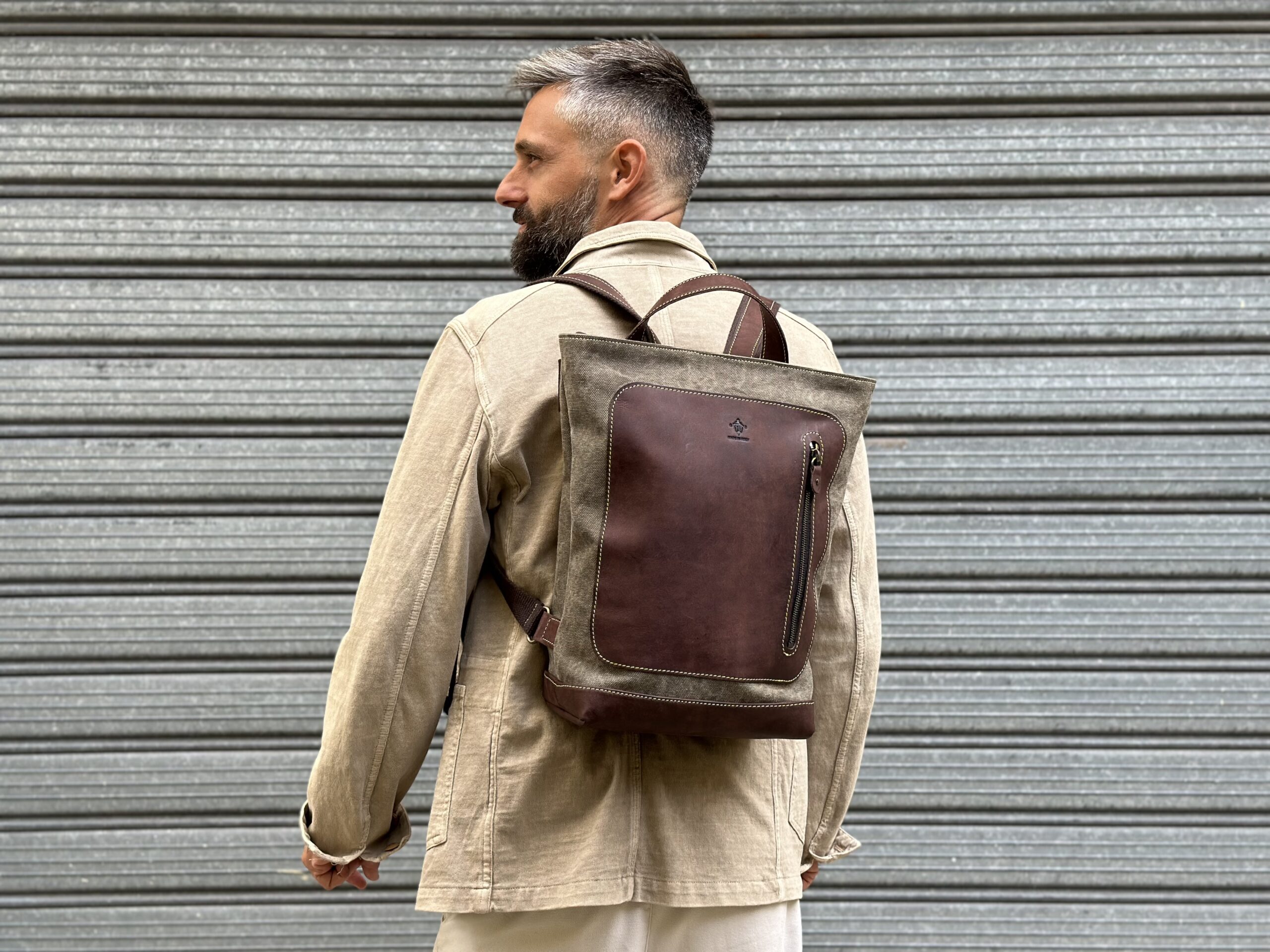| Specifiche: | Chiusura in testa zip Tasca posteriore con zip 20 cm tasca Interna rifinita in pelle con zip tela olona verde militare e cuoio scuro |