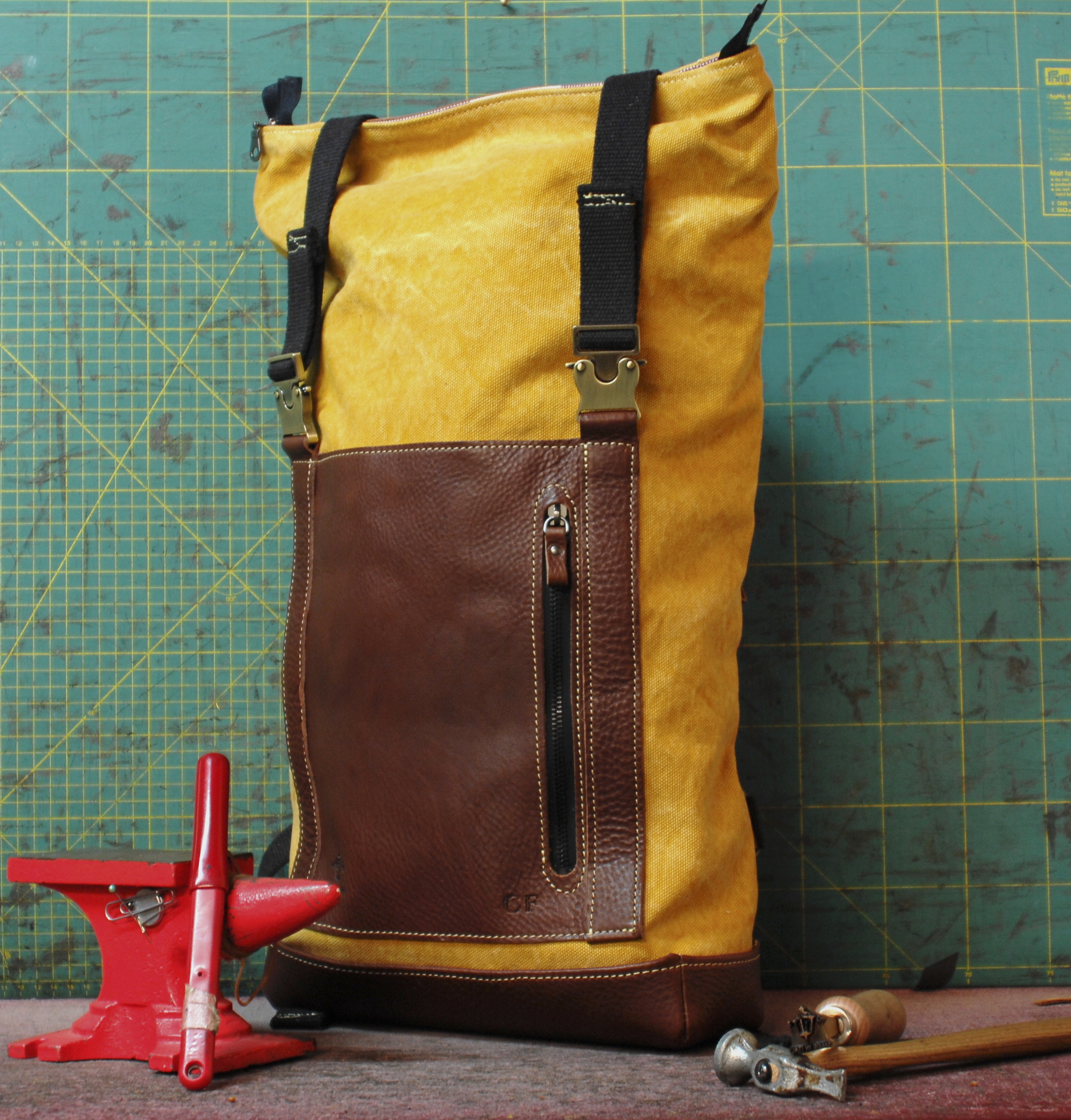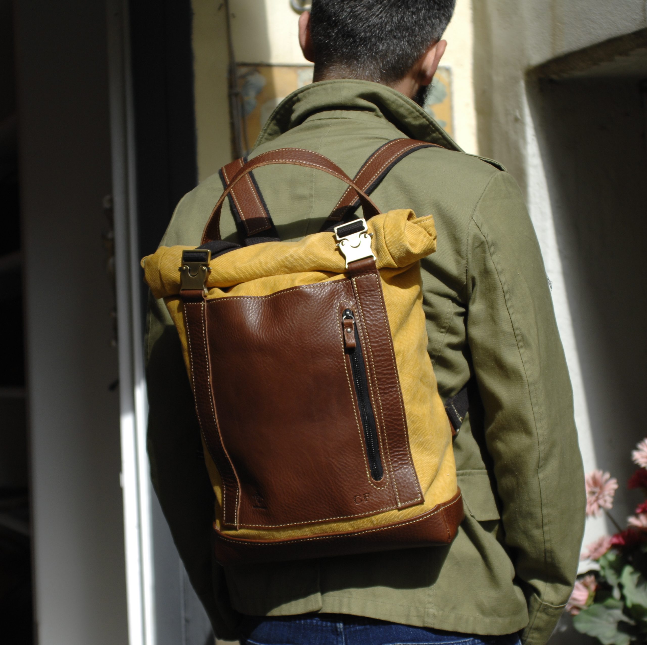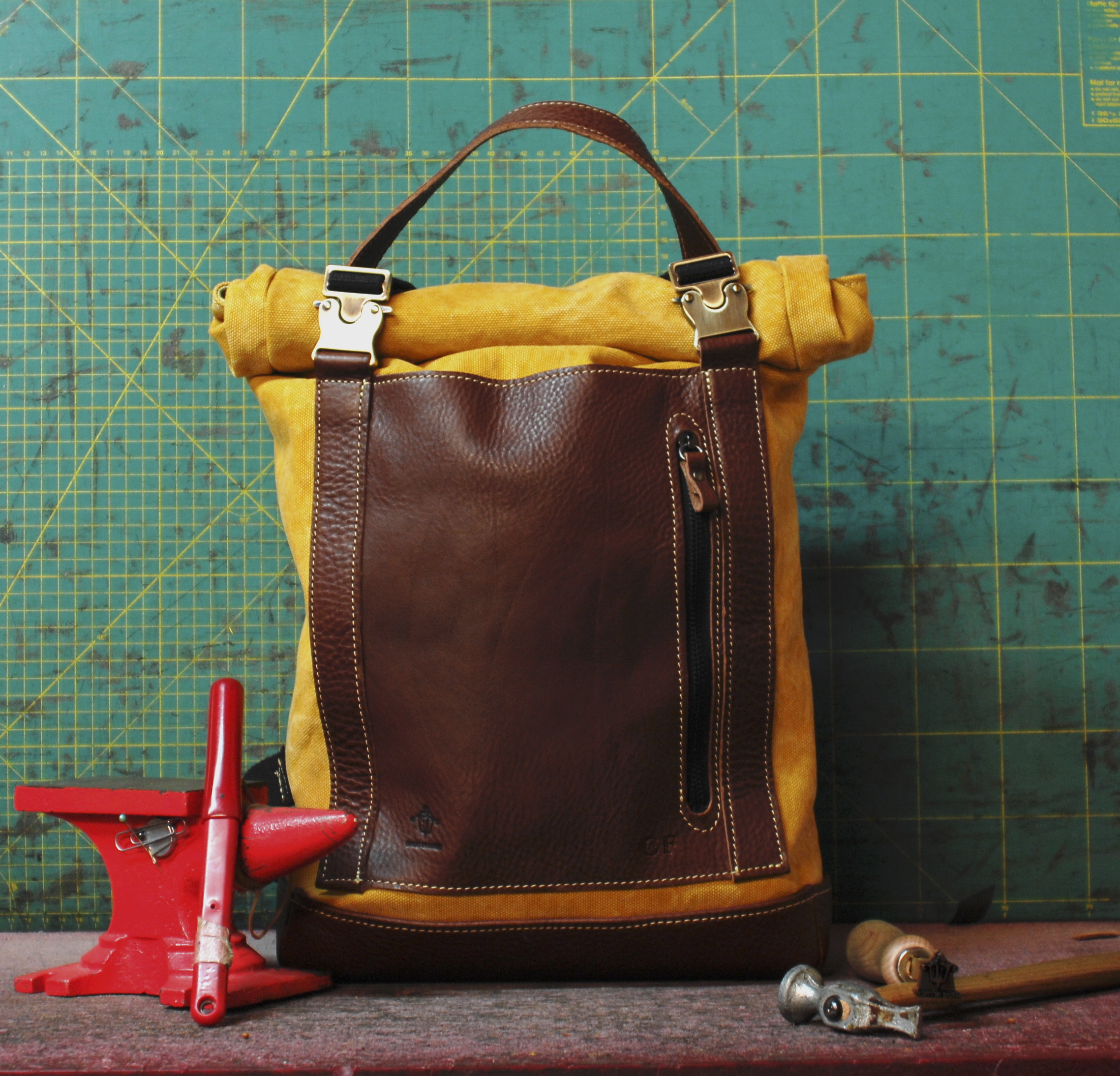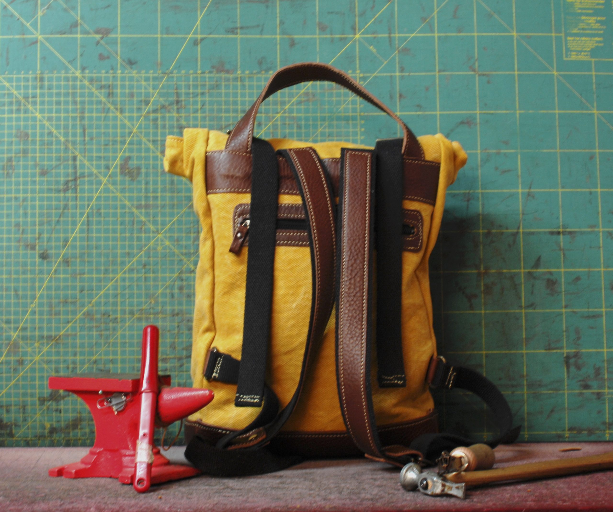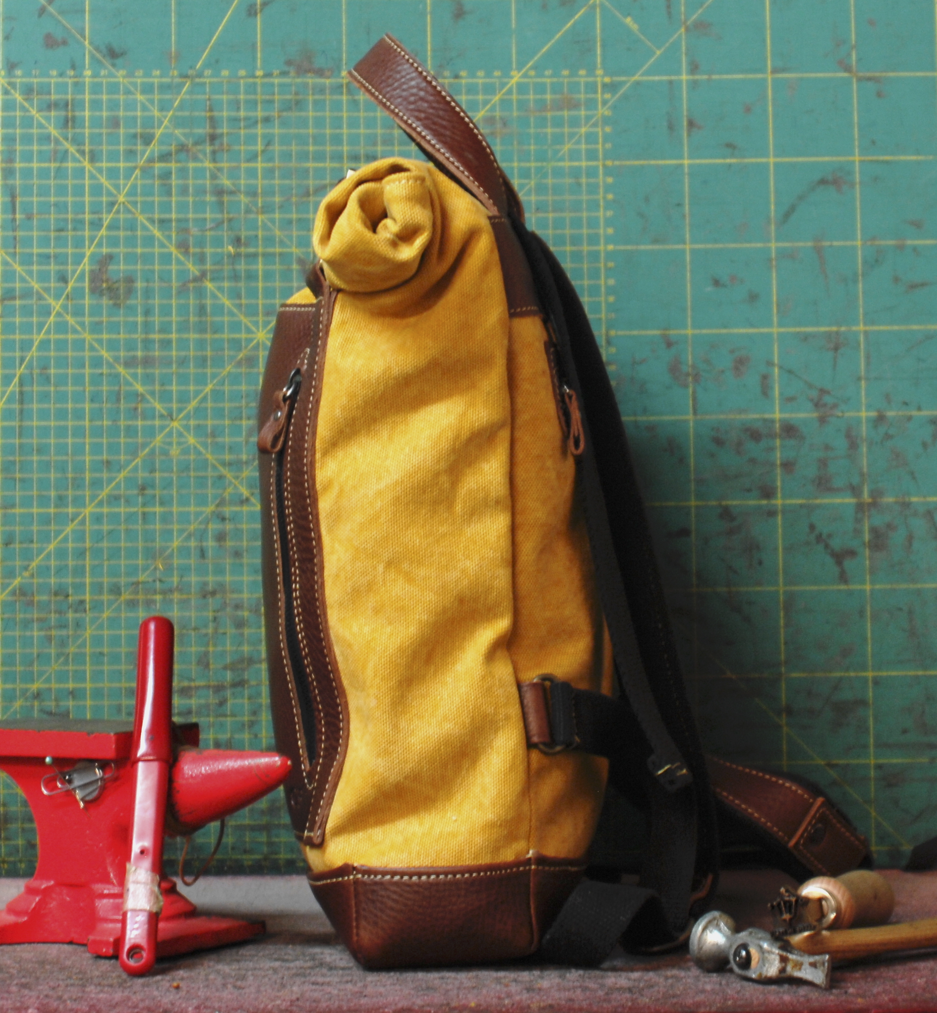 Zaino rolltop in tela olona giallo ocra e vacchetta cuoio scuro