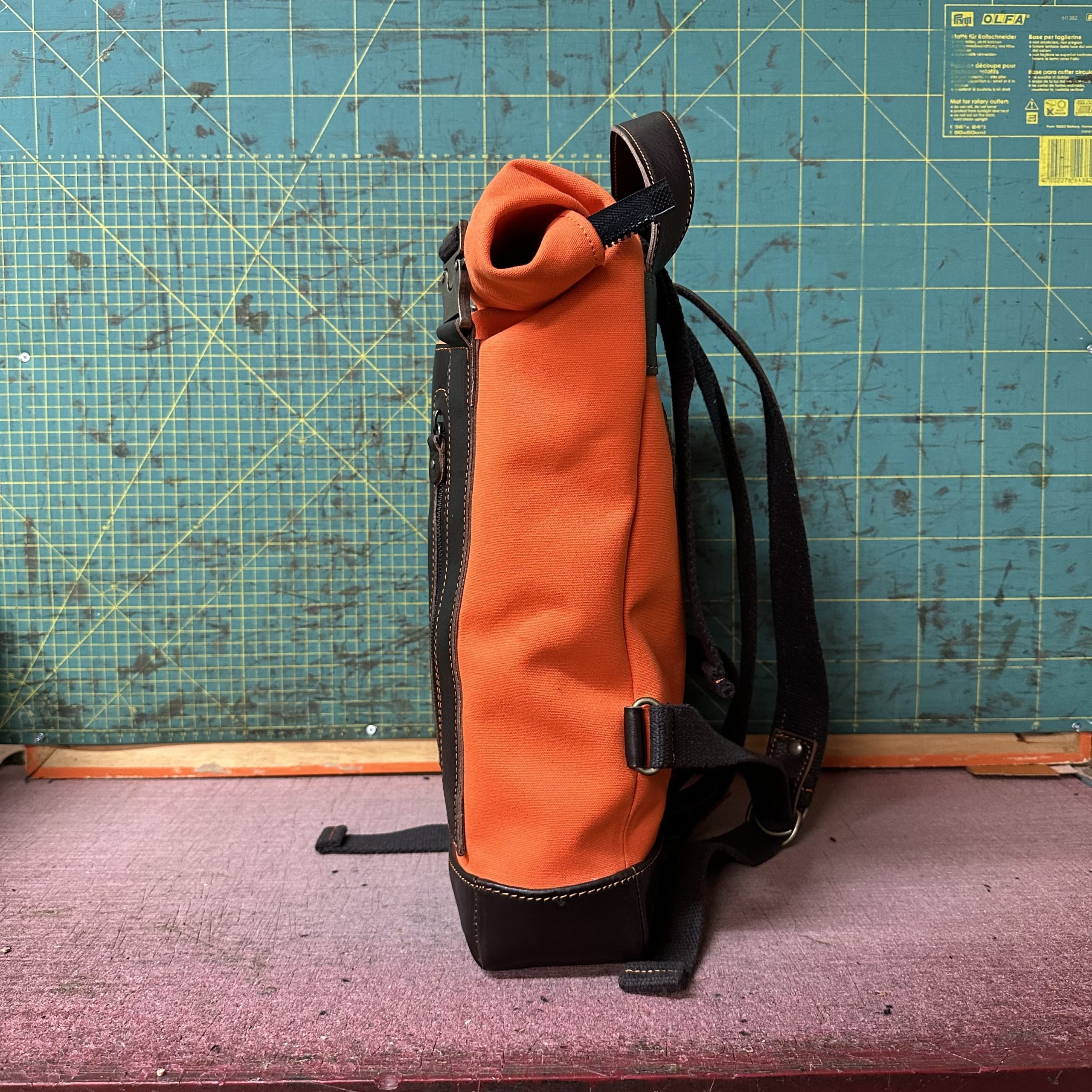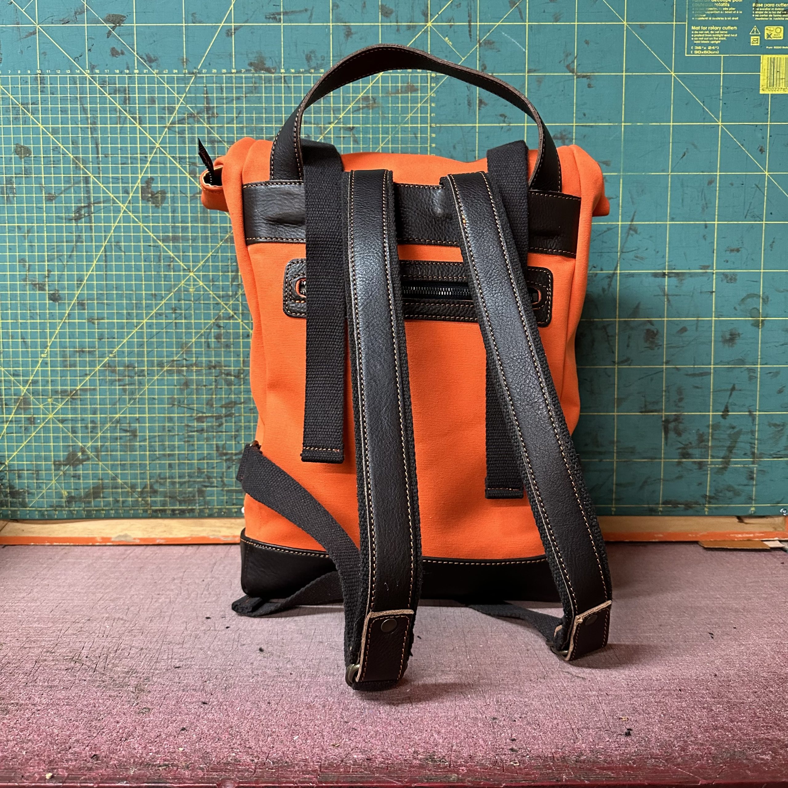 Zaino rolltop in tela olona e vacchetta conciata in fossa.