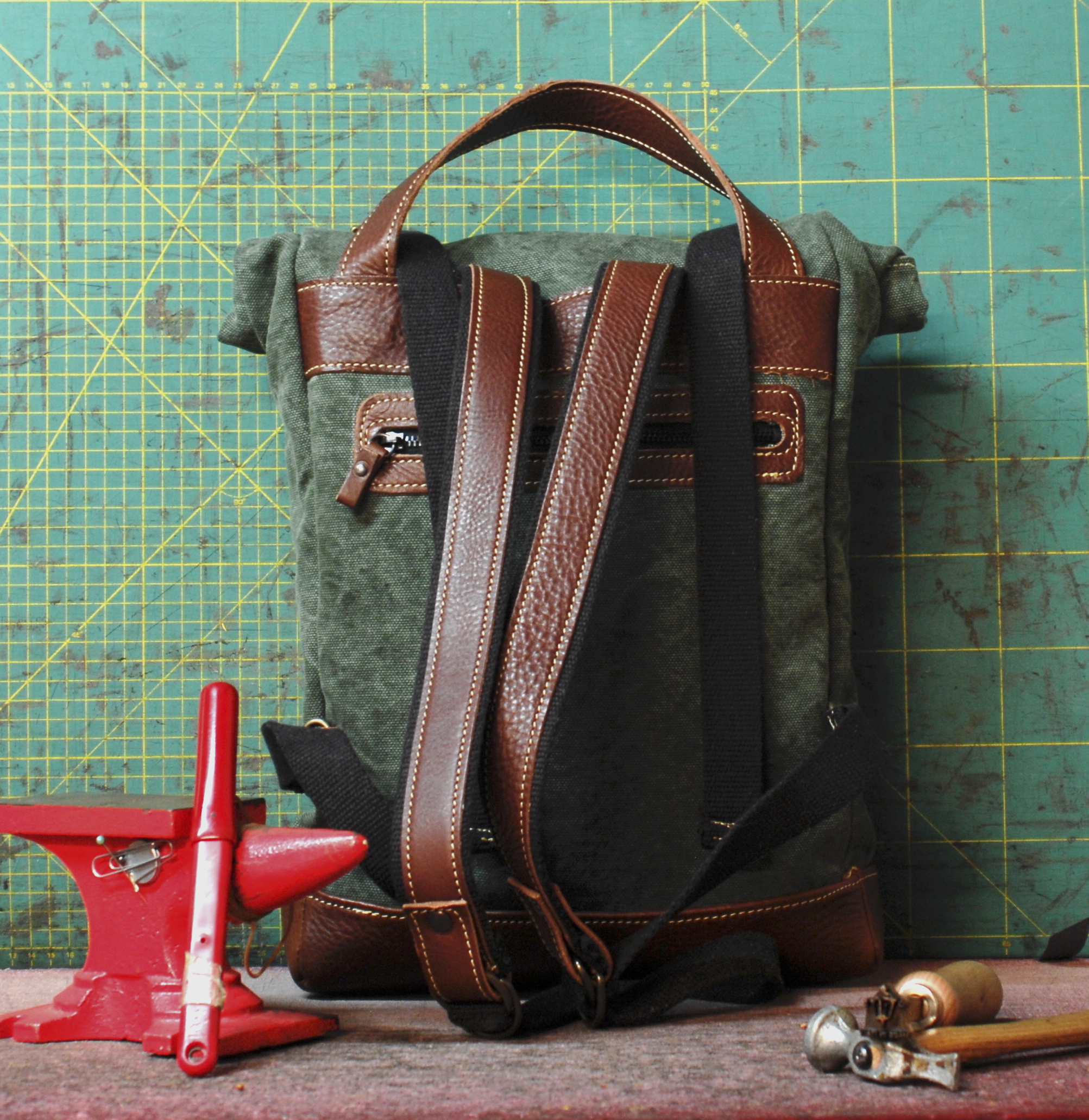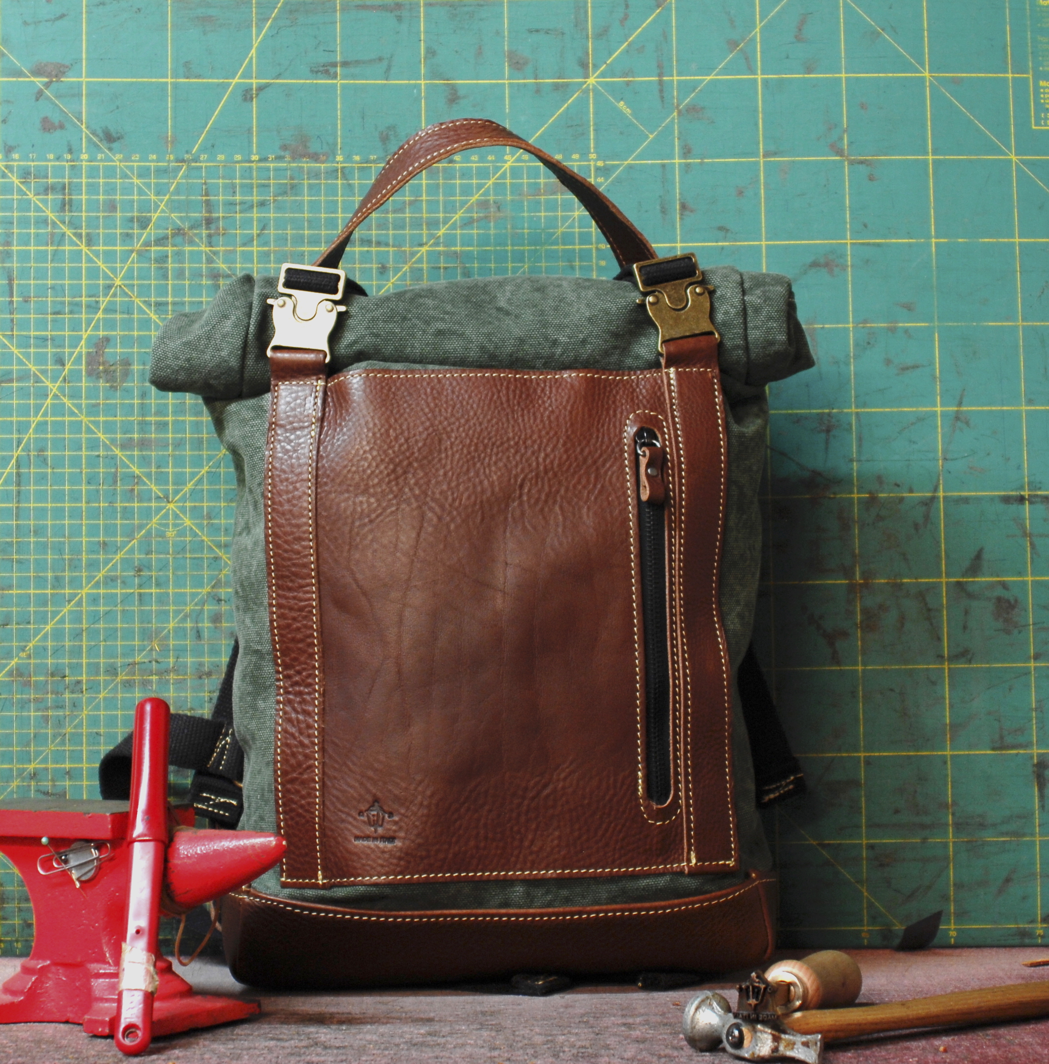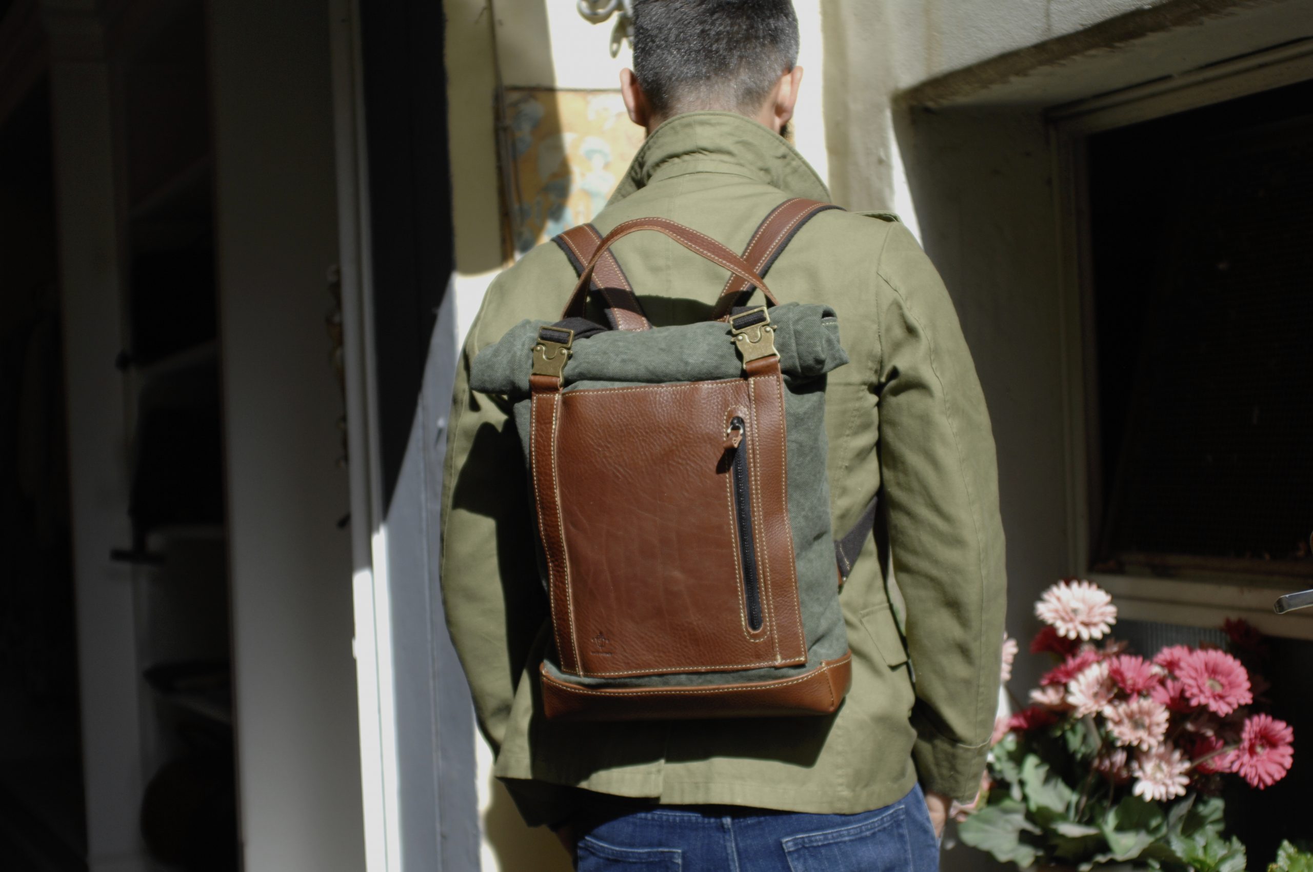 Zaino rolltop in tela olona verde bosco e vacchetta cuoio scuro