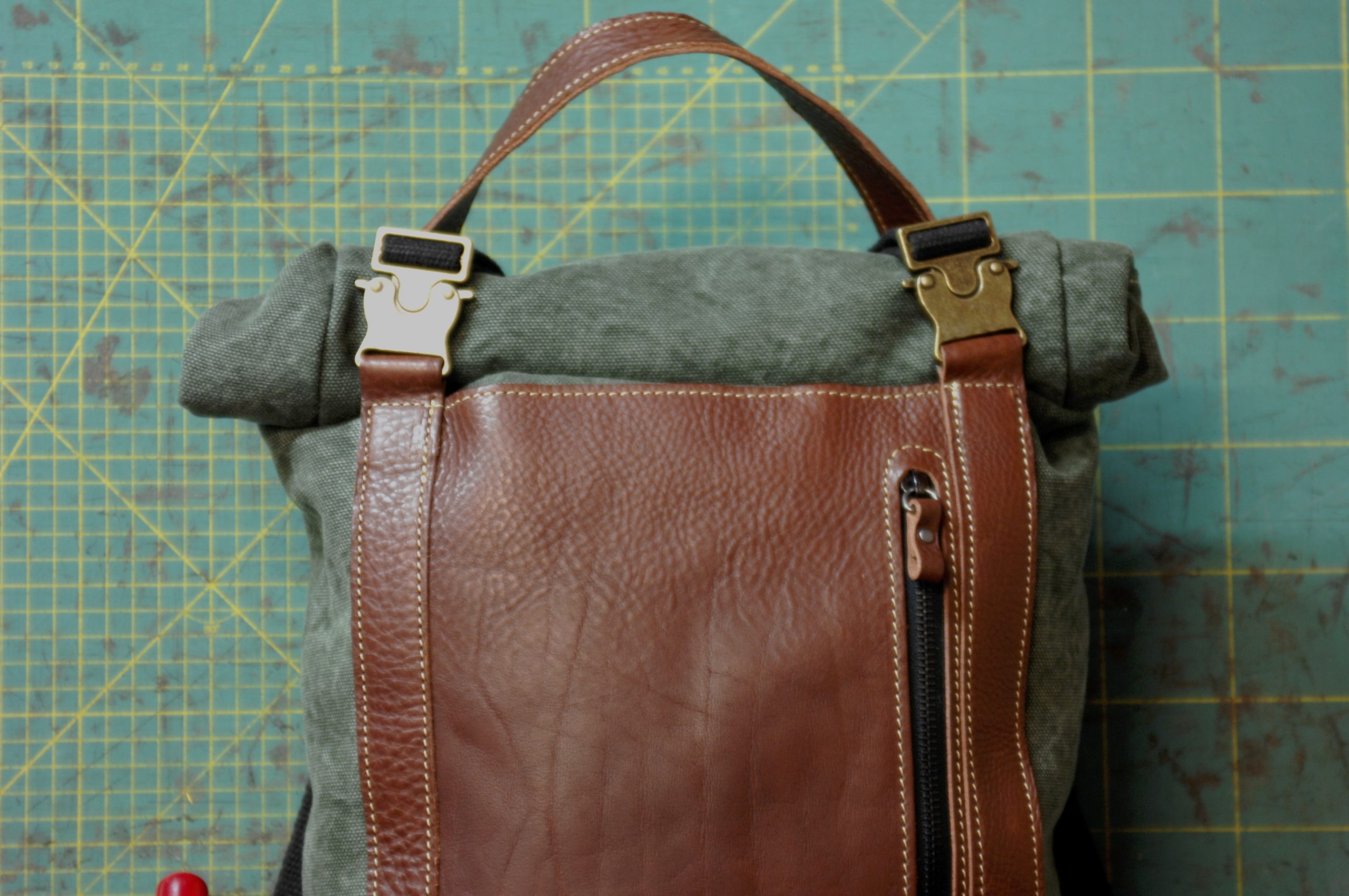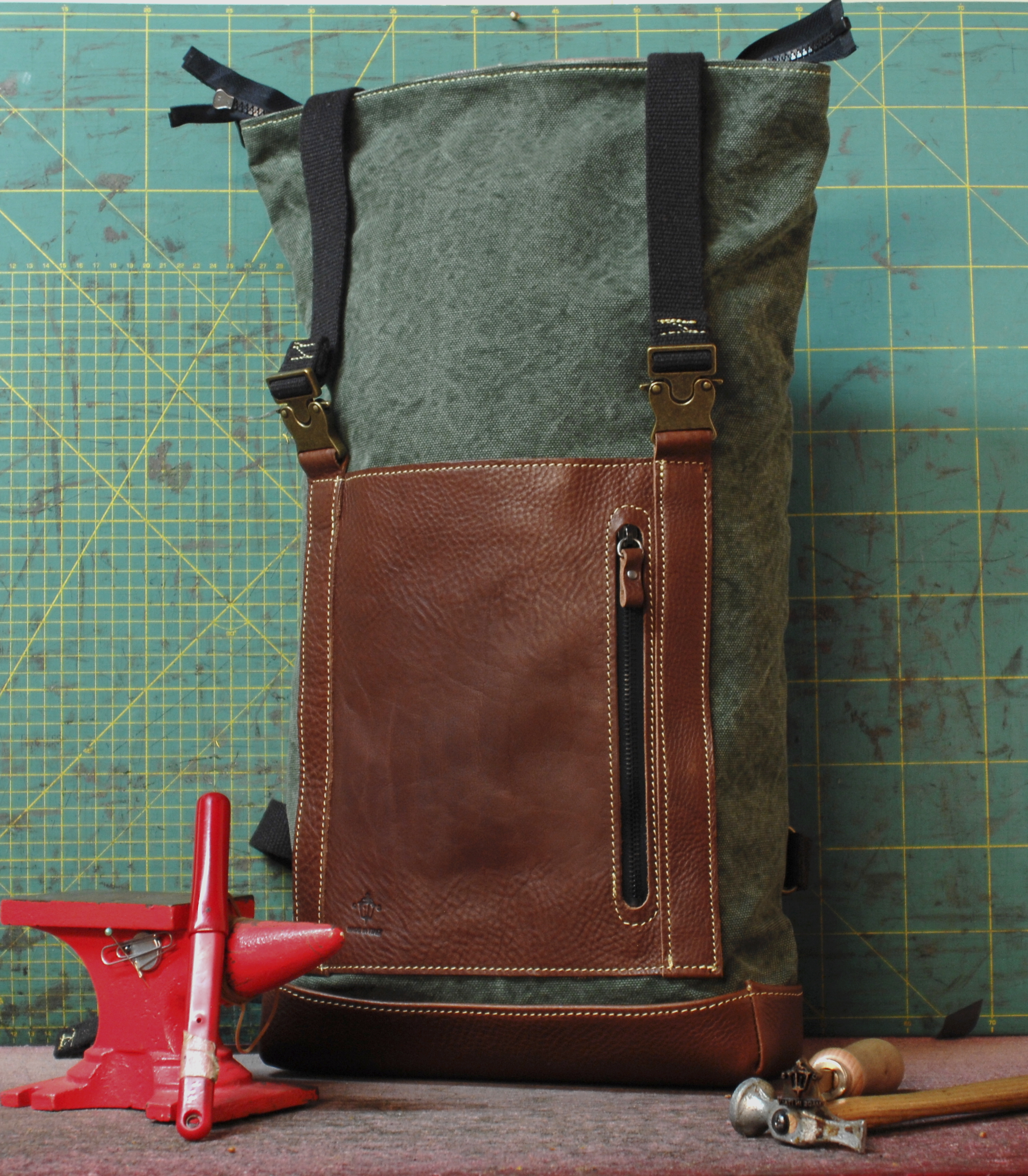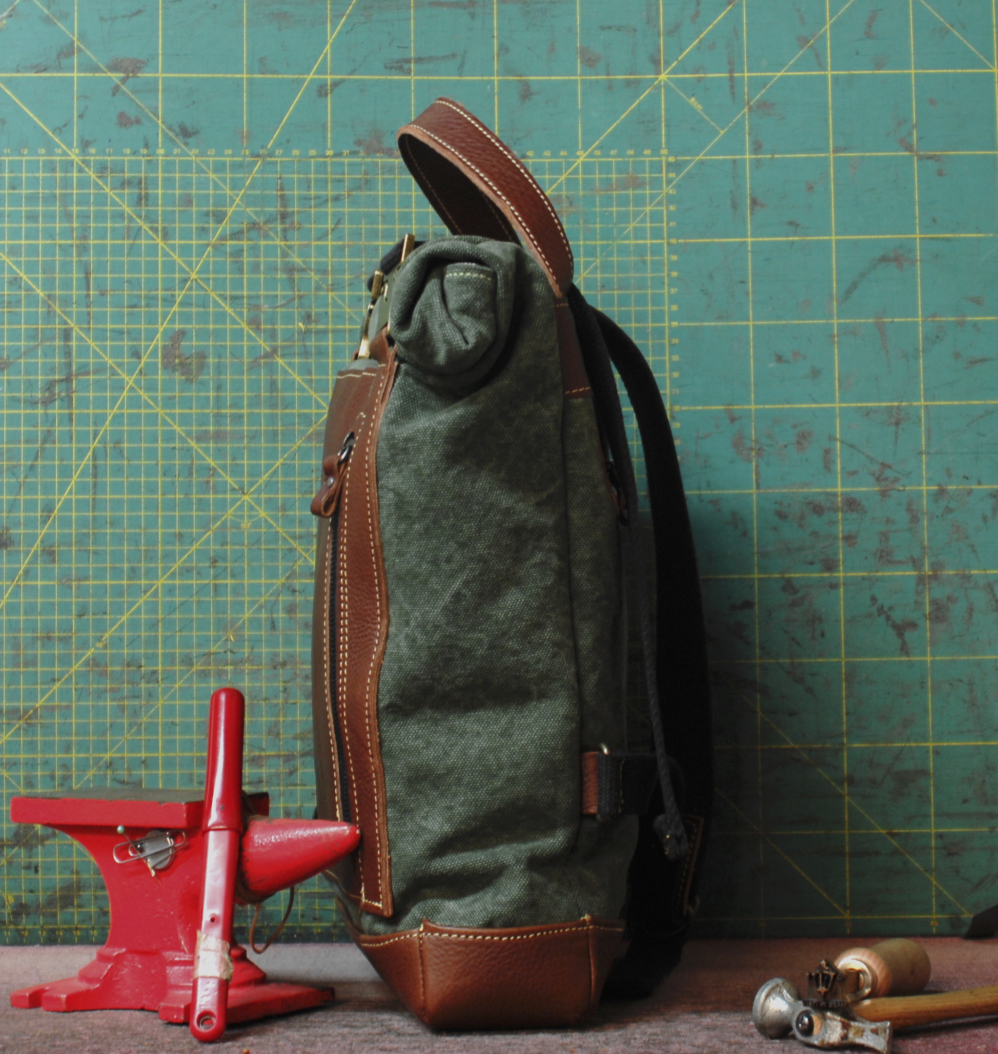 Zaino rolltop in tela olona verde bosco e vacchetta cuoio scuro