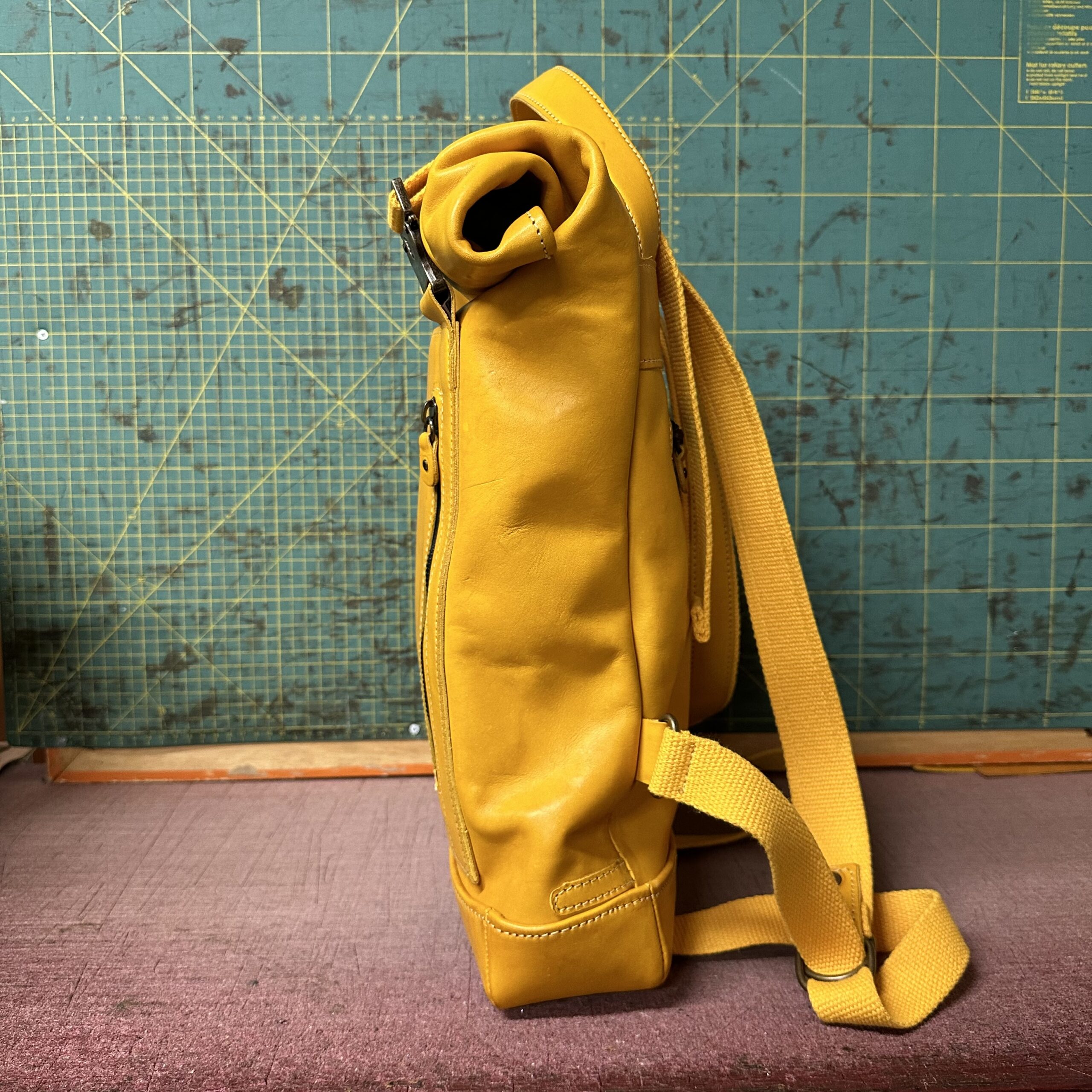 Zaino rooltop dalle dimensioni regolabili. Completamente in vacchetta volanata naturale.