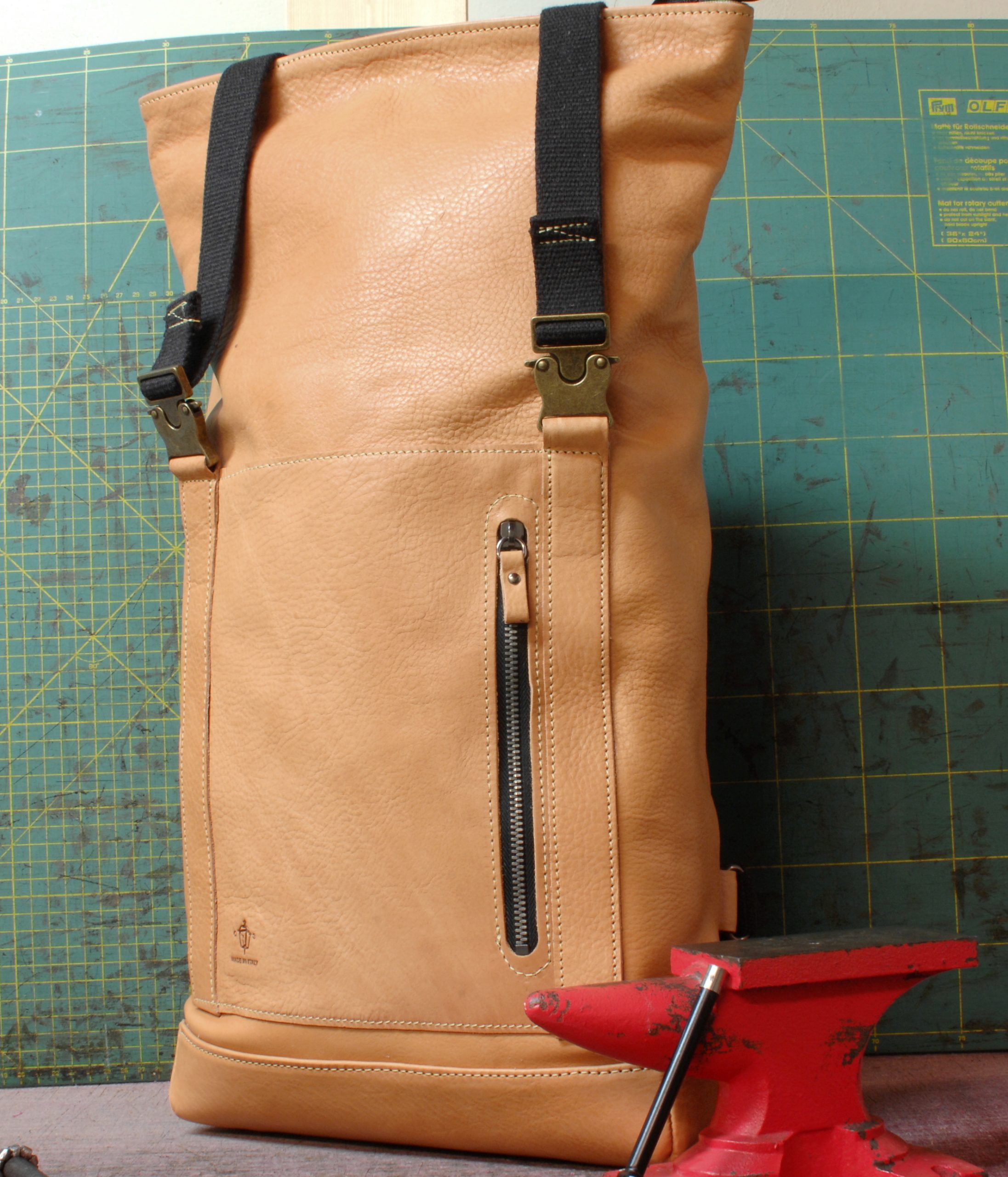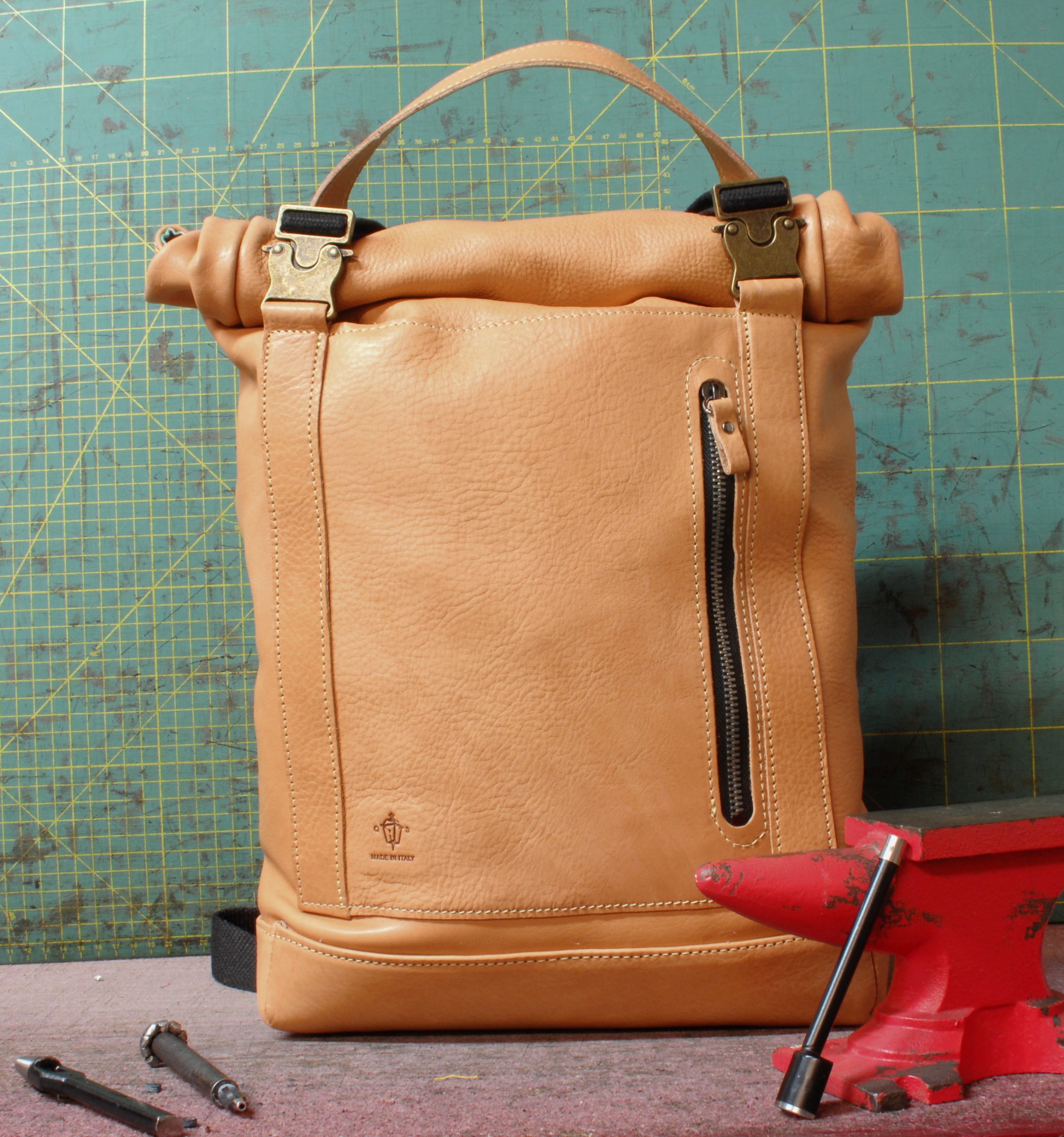 Come ogni pezzo che vedete nel mio negozio,è realizzato completamente da me in ogni suo passaggio,dal disegno,alla creazione del modello in cartoncino,dal taglio della pelle all’assemblaggio e cucitura. Compresa ricerca di tutti i materiali dalla pelle,nelle migliori concerie di Santa Croce sull’Arno in Toscana,polo europeo per la concia, a tutto quello che riguarda accessori e tessuti tutto proveniente dall’Italia!