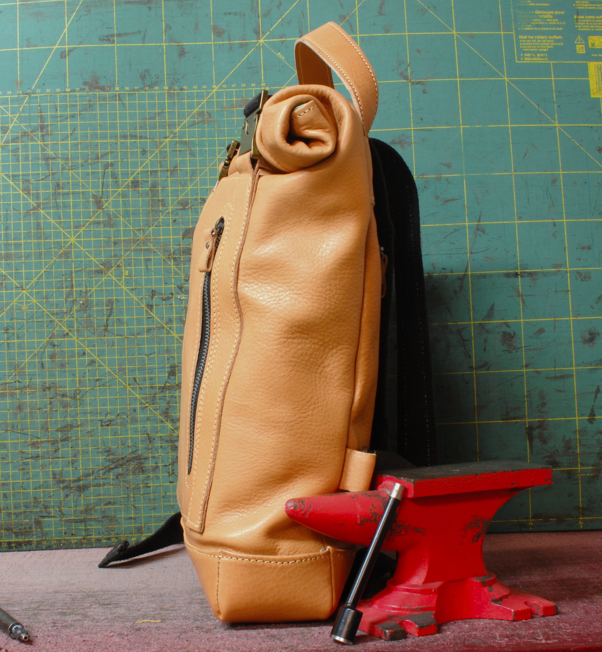 Zaino rooltop dalle dimensioni regolabili. Completamente in vacchetta volanata naturale.