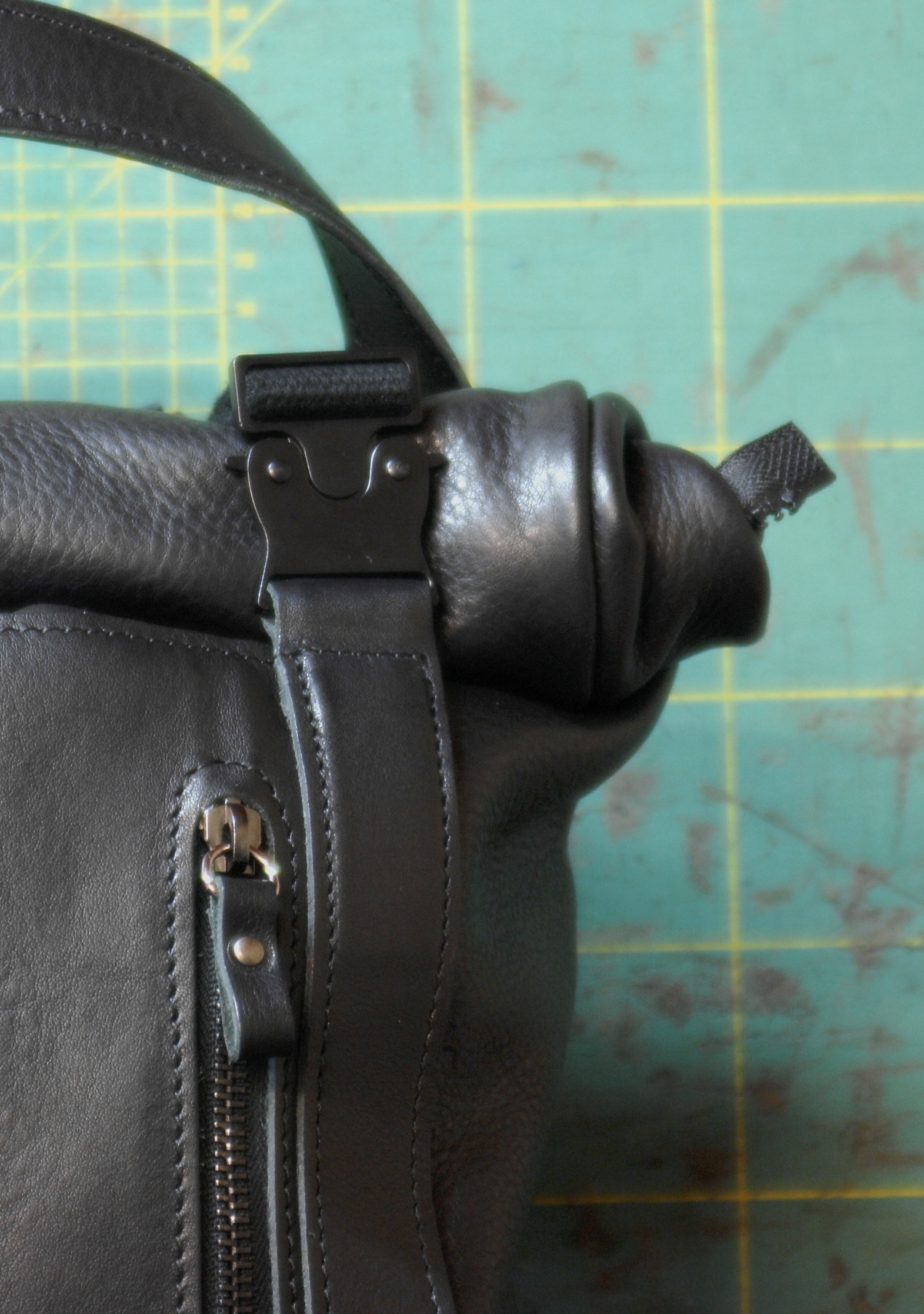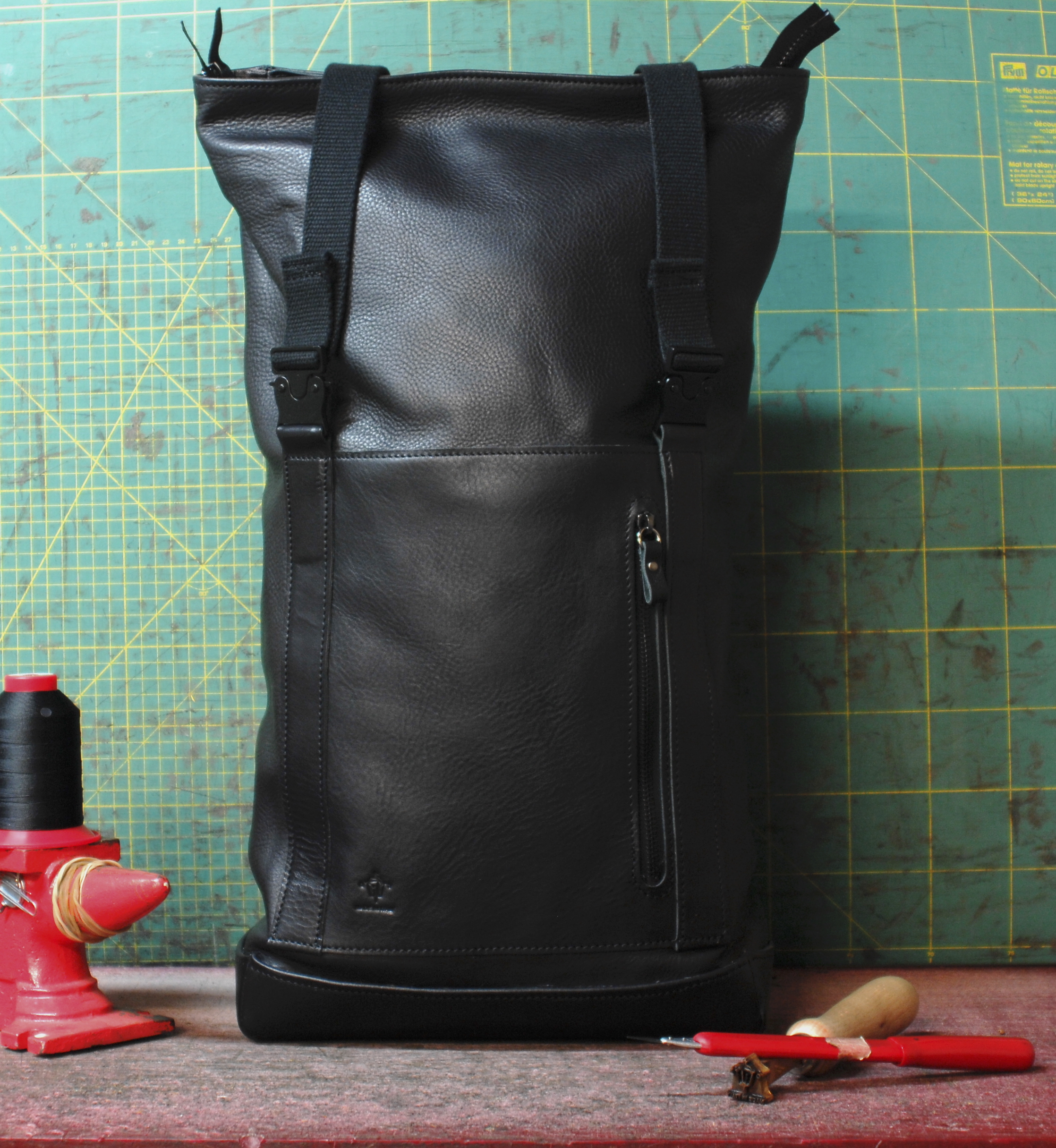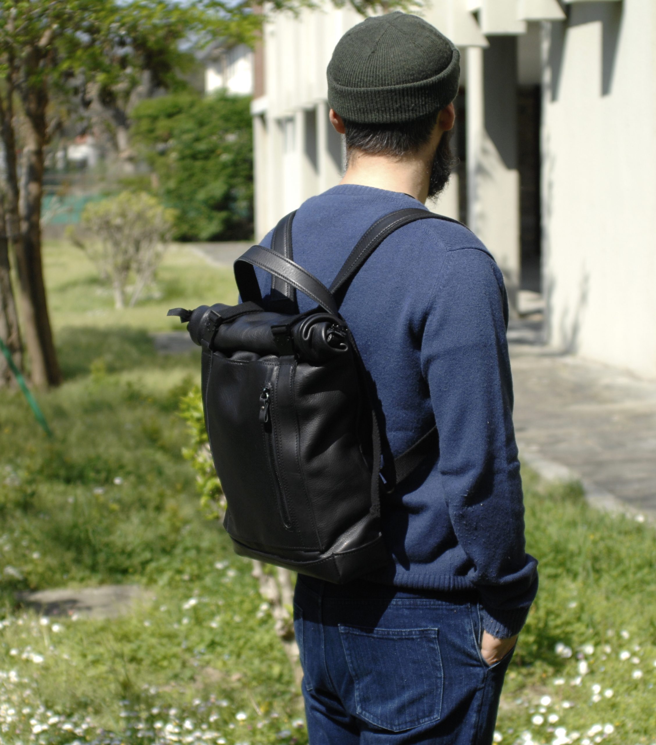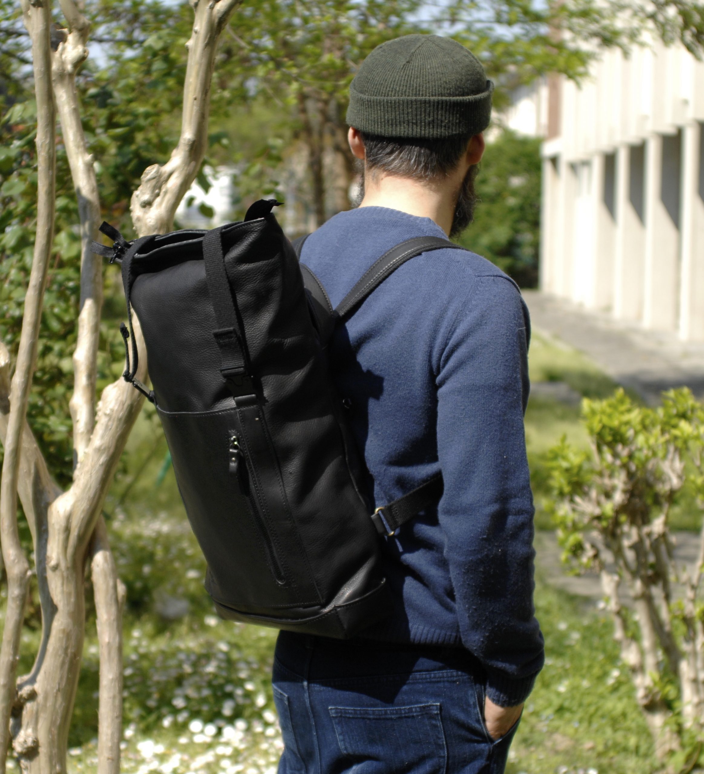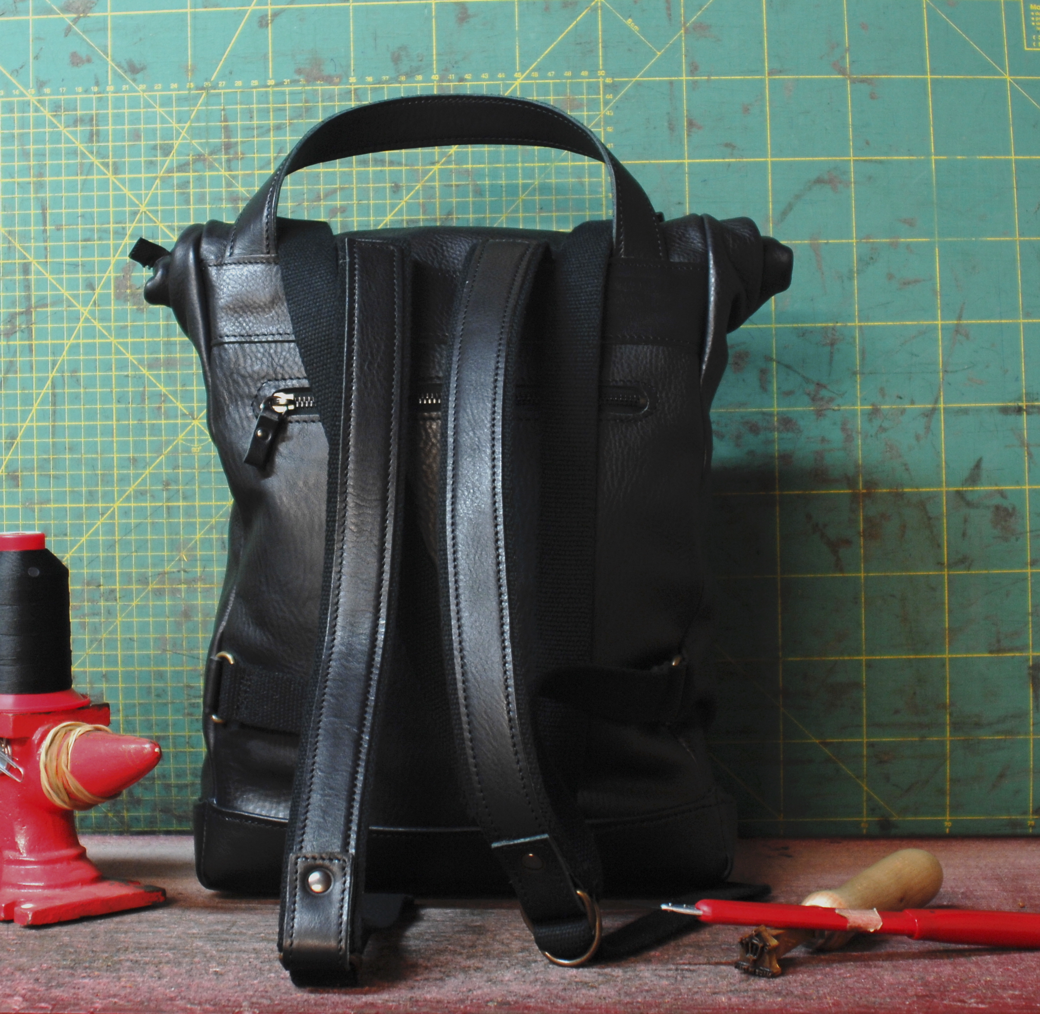 Zaino rooltop dalle dimensioni regolabili. Completamente in vacchetta volanata nera.