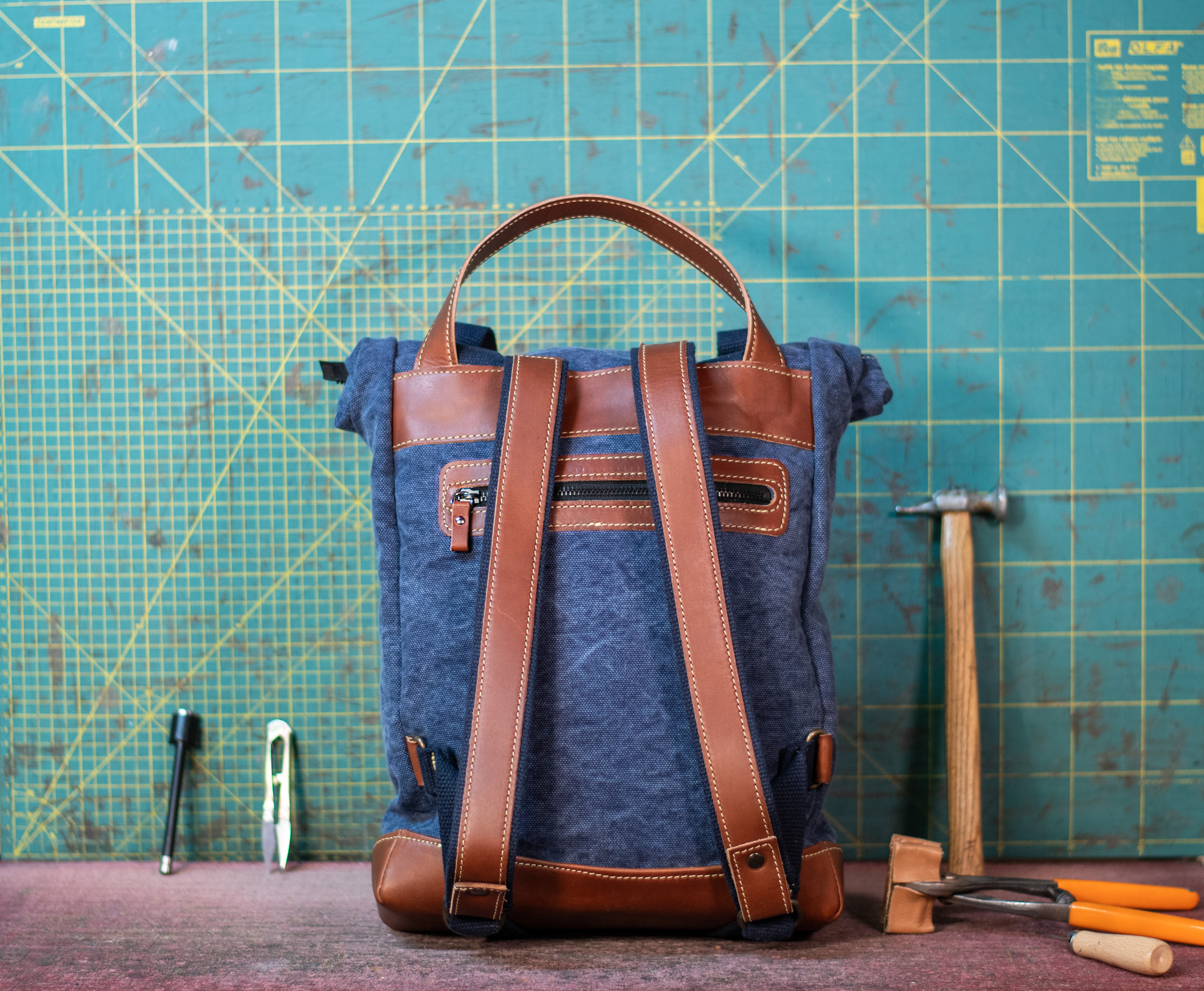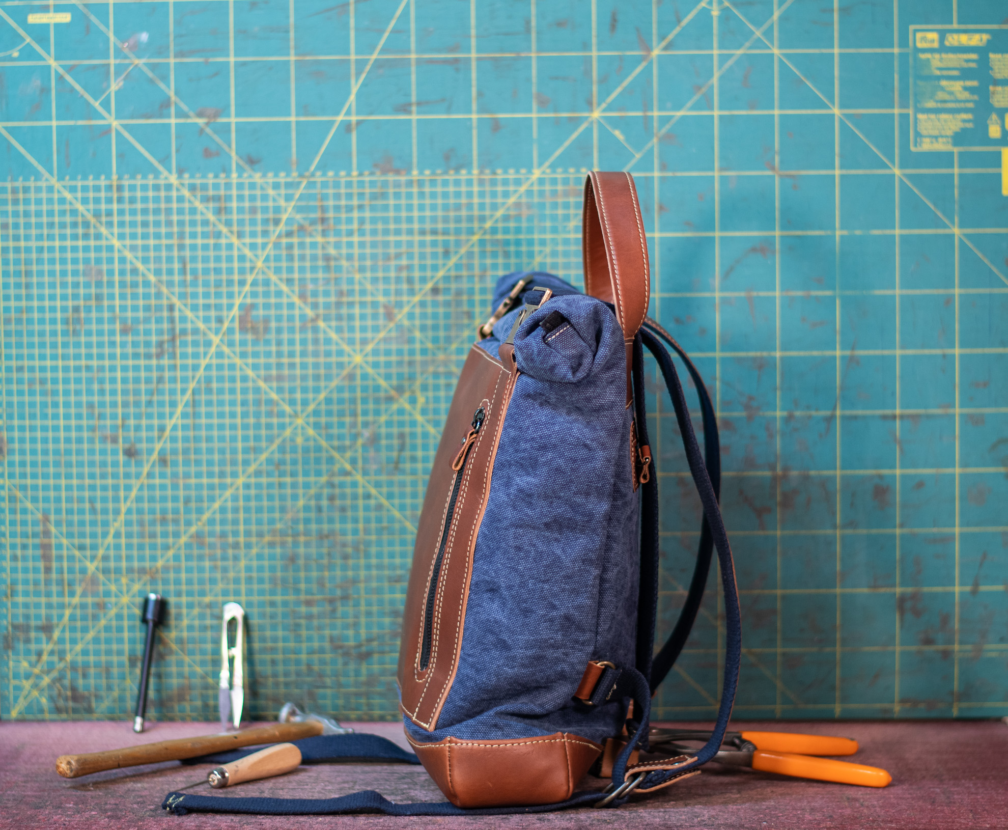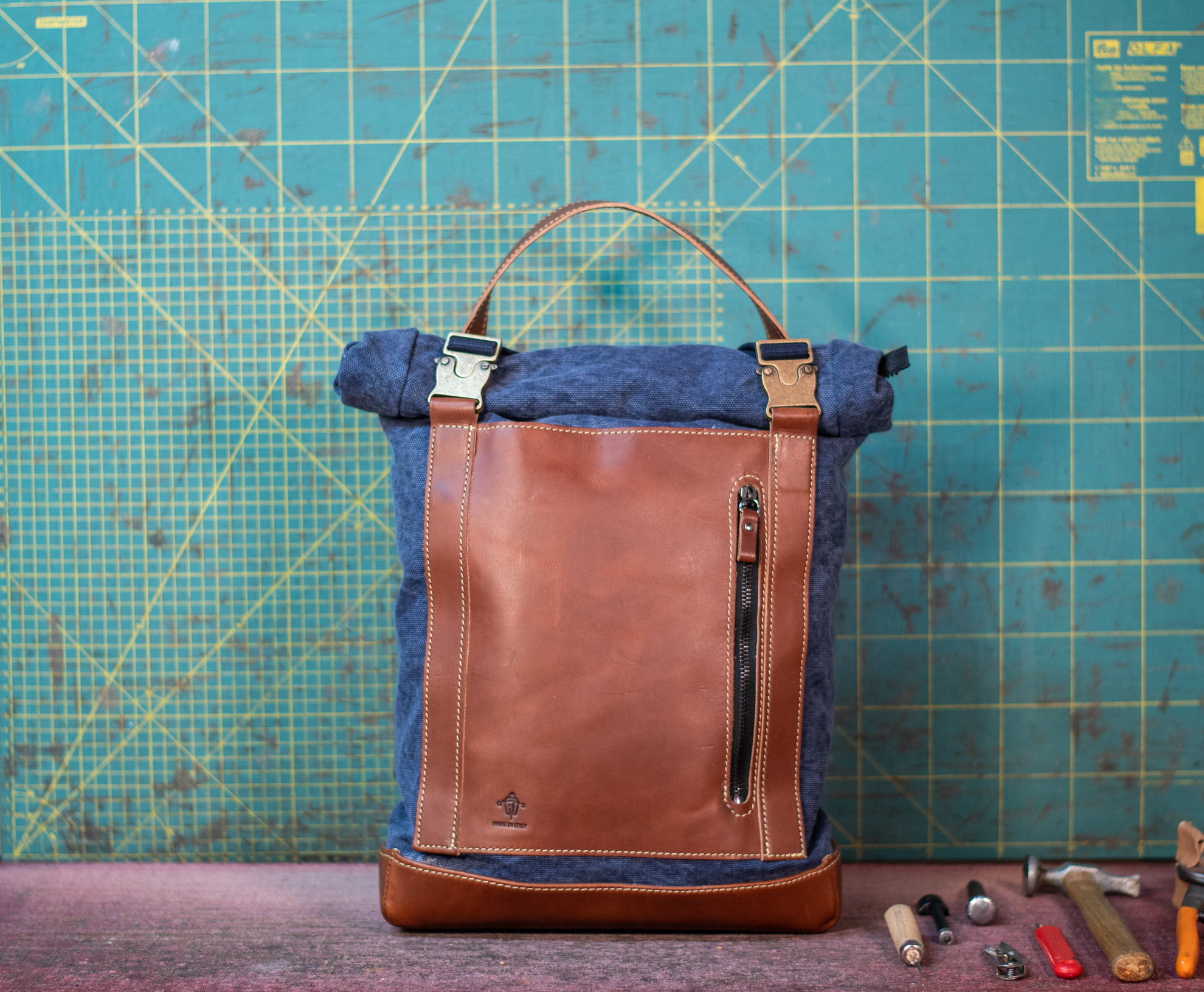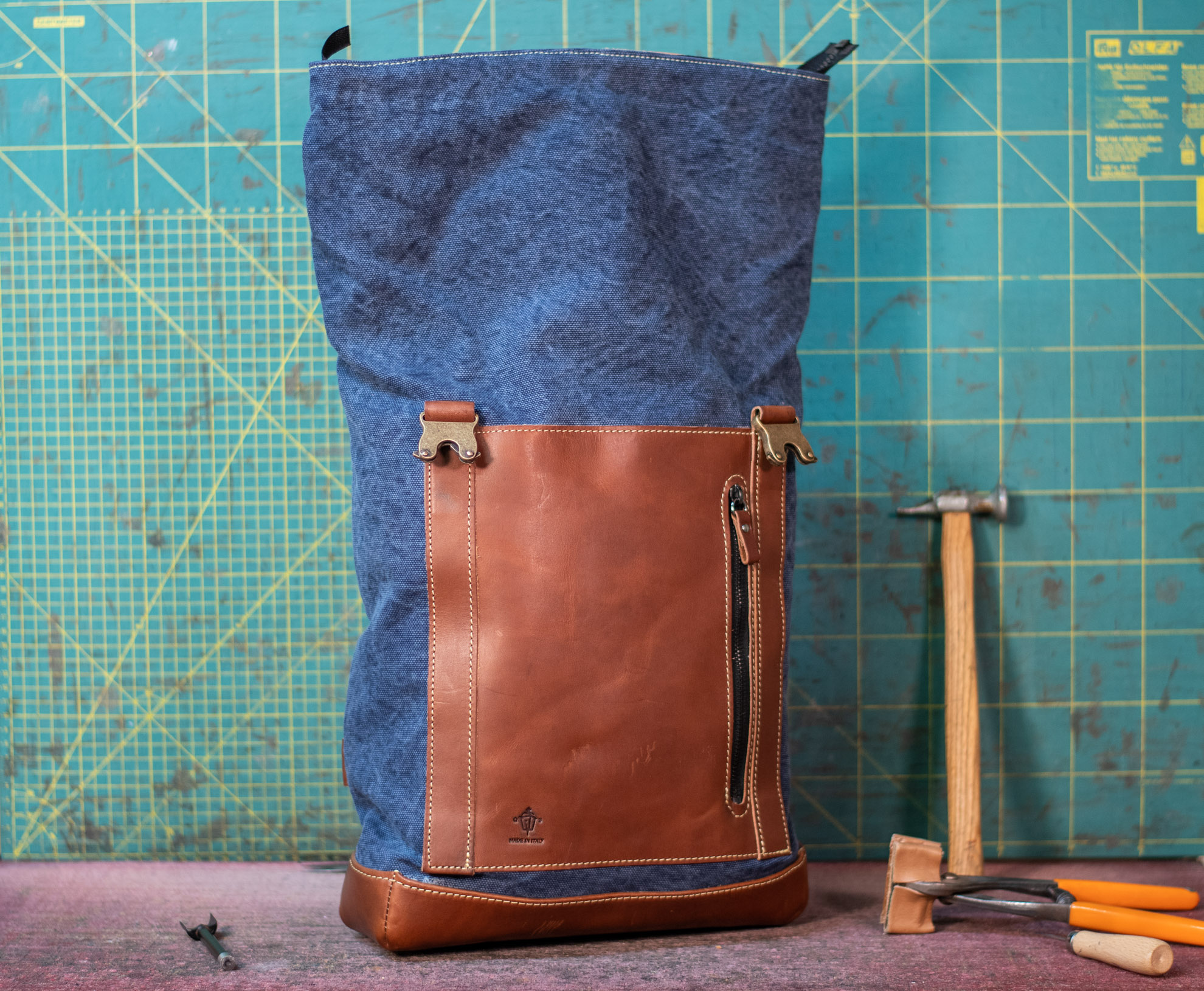 Zaino rolltop in tela olona e vacchetta conciata in fossa.