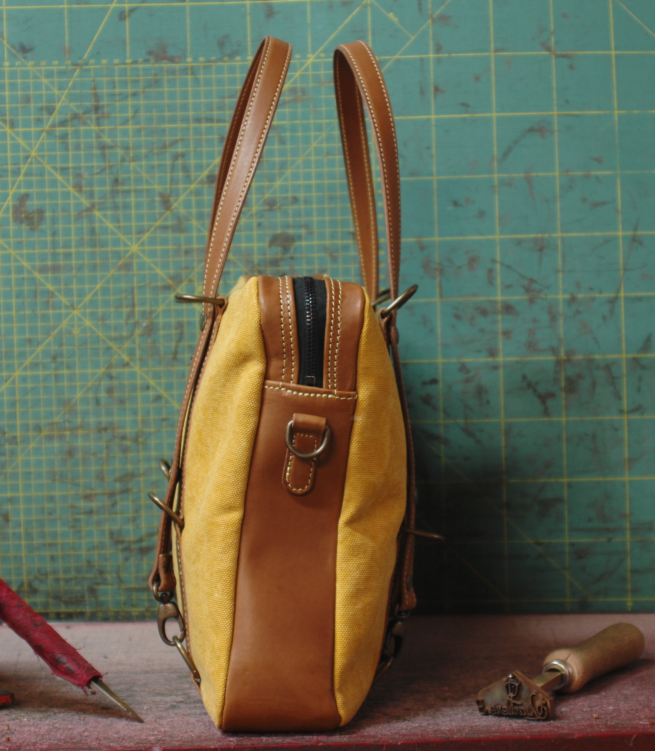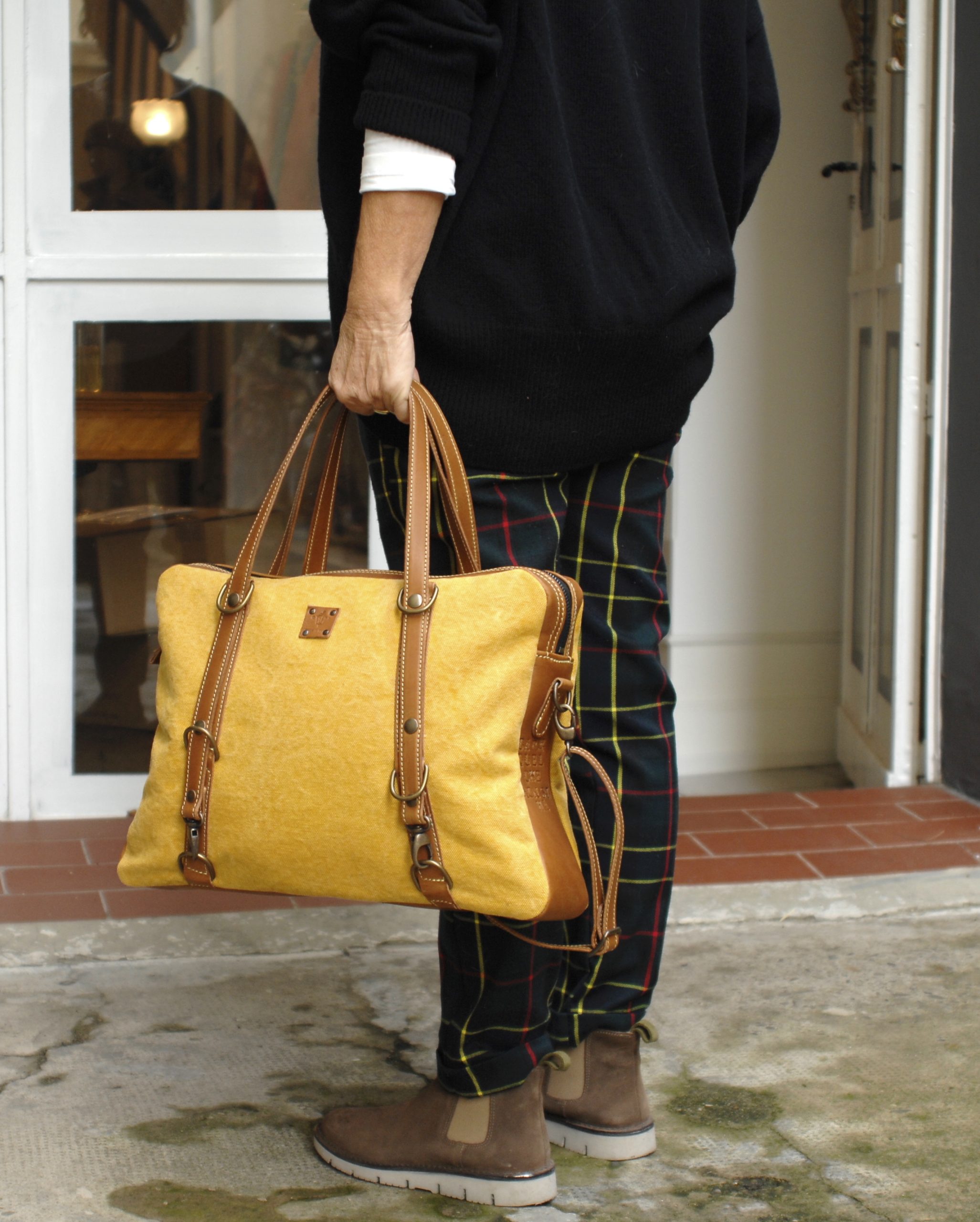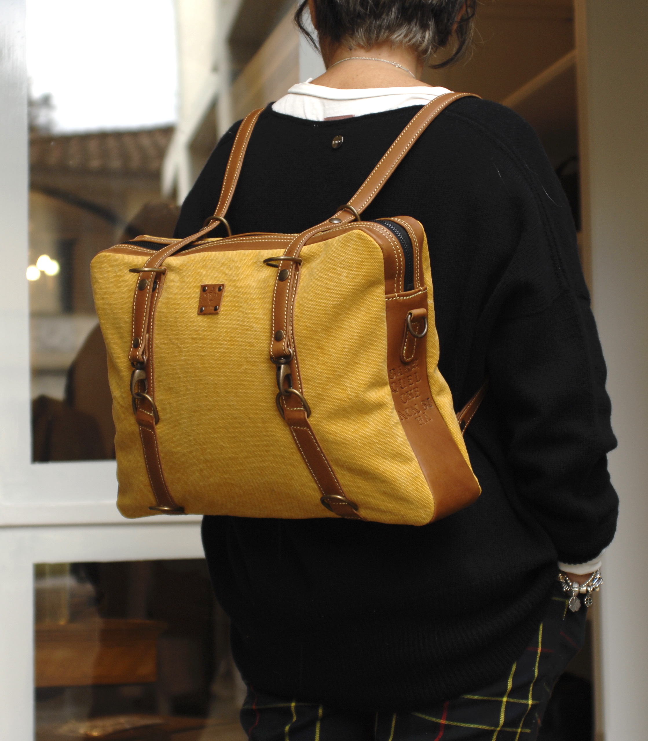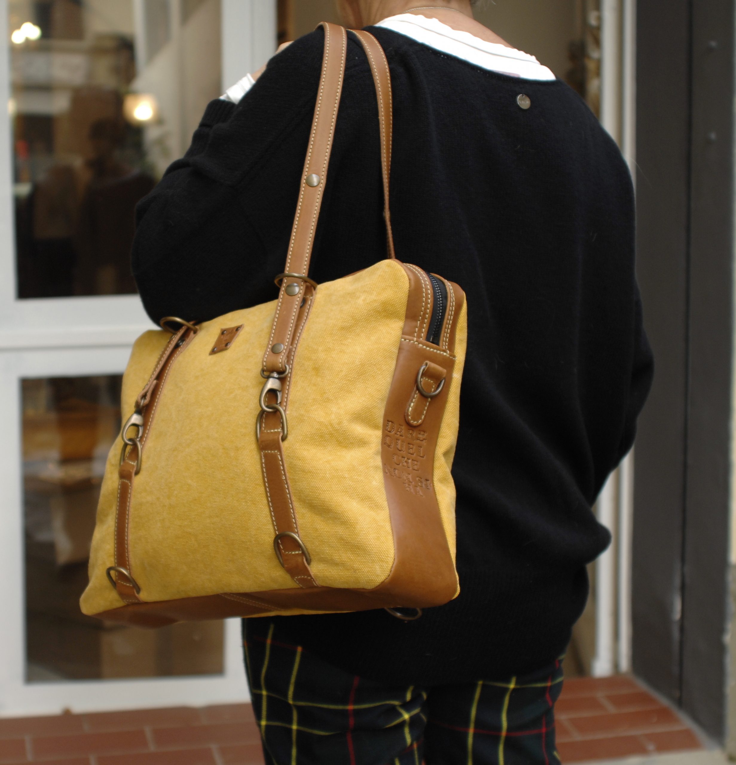 | Specifiche: | versione in tela olona giallo ocra e cuoio tripla funzione -borsa a mano -borsa a spalla -zainetto |