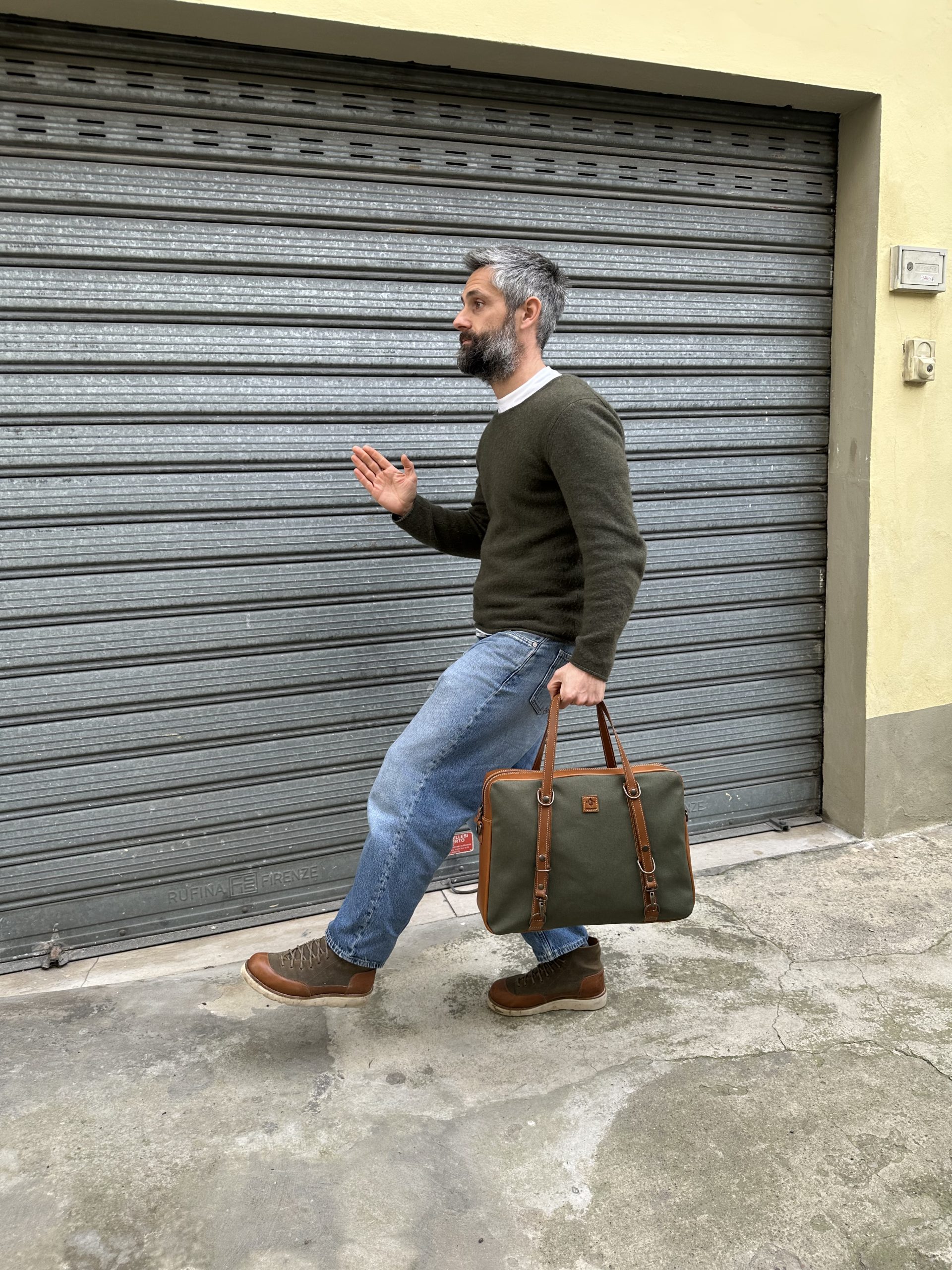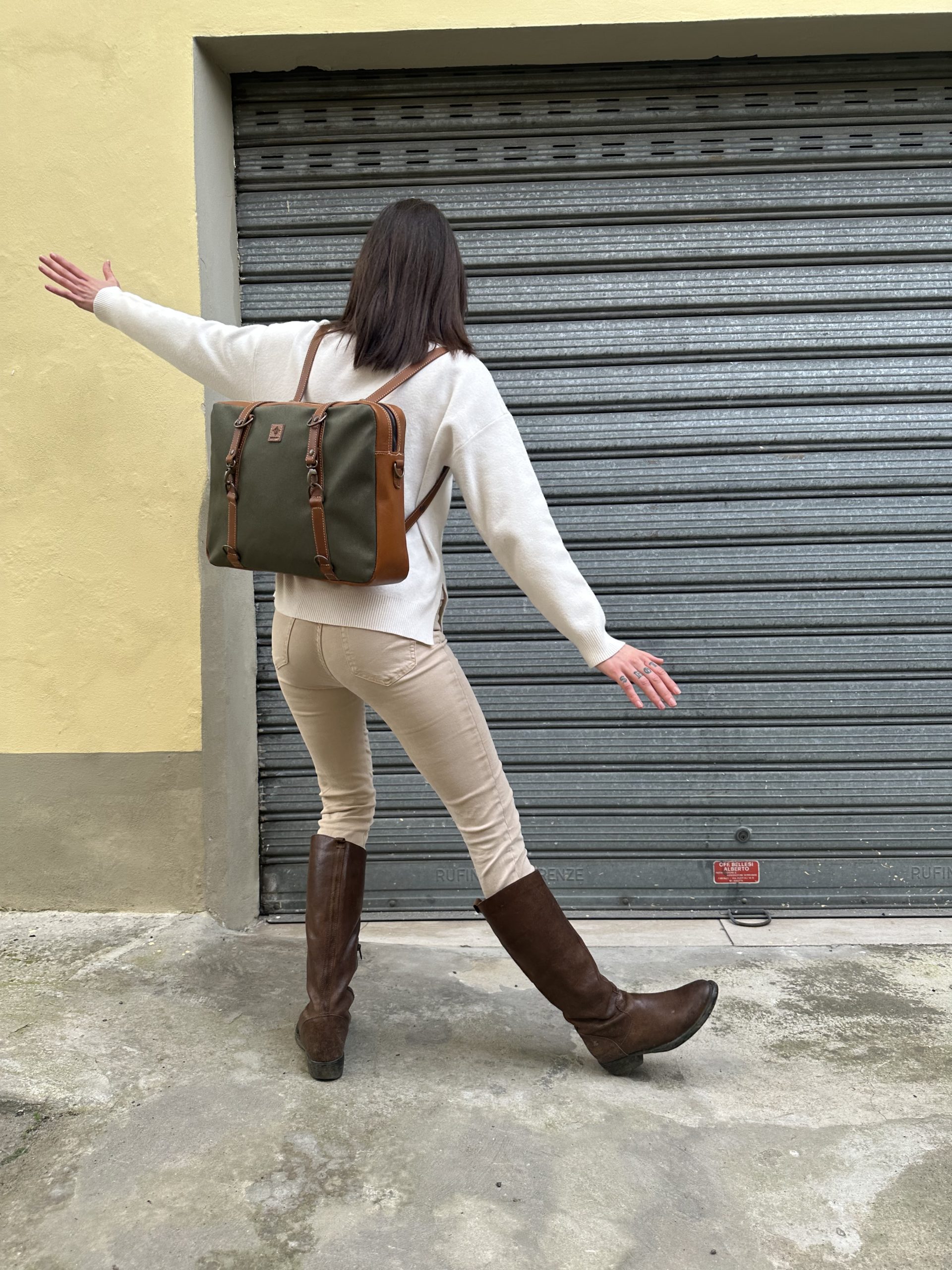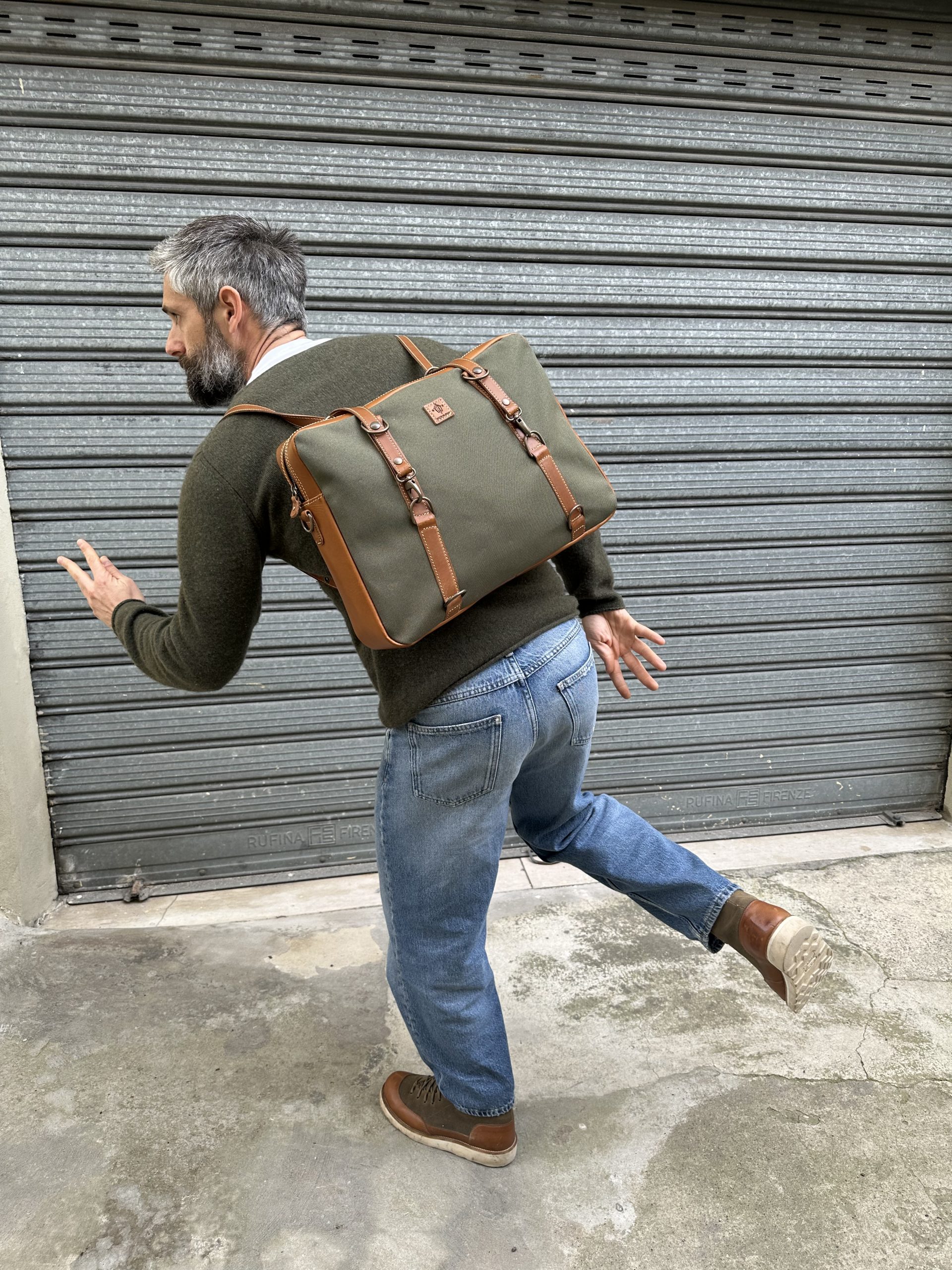 TRIBAG OPUS in Tela Olona Verde Mil. Unito e Vacchetta Cuoio