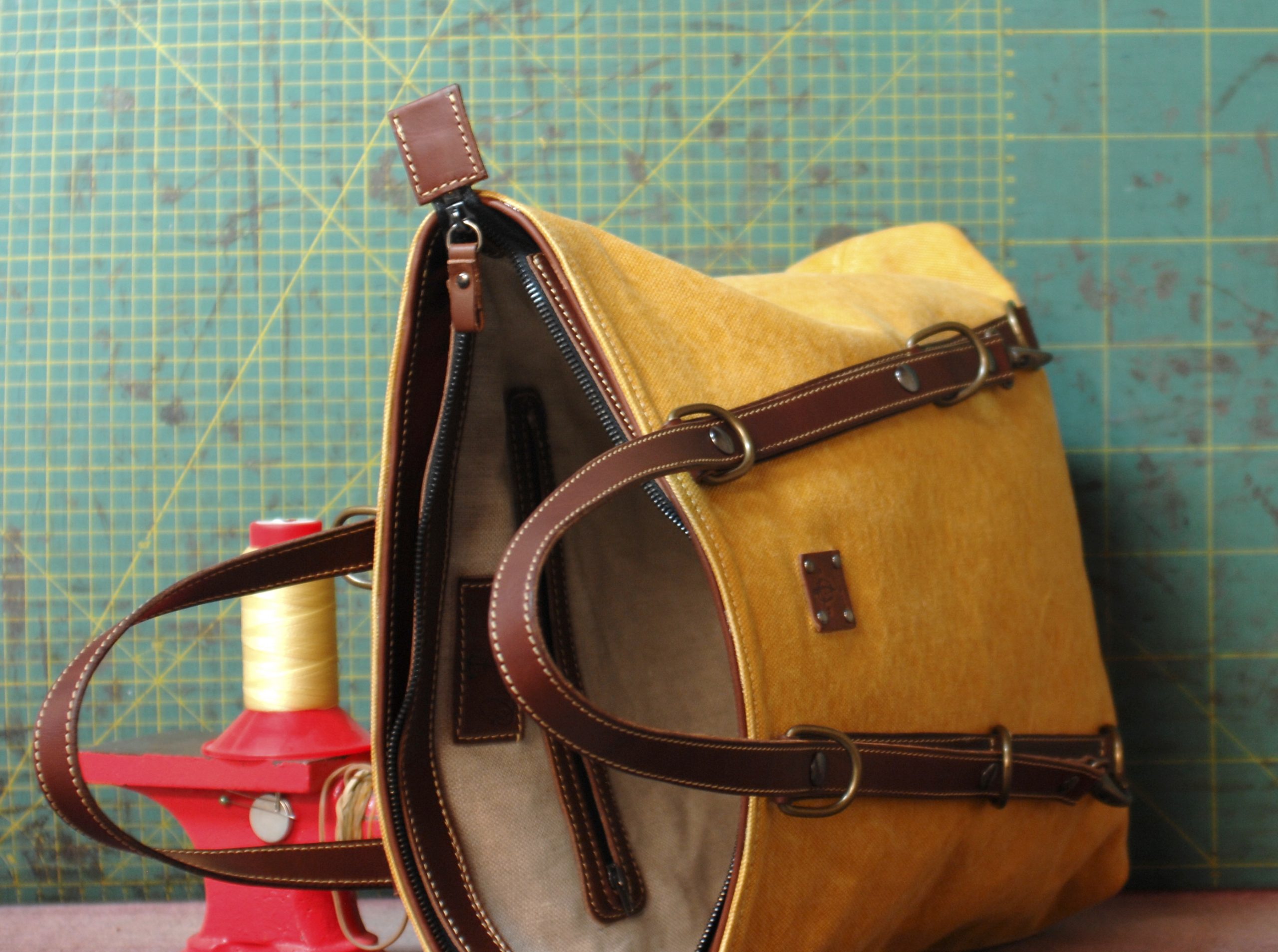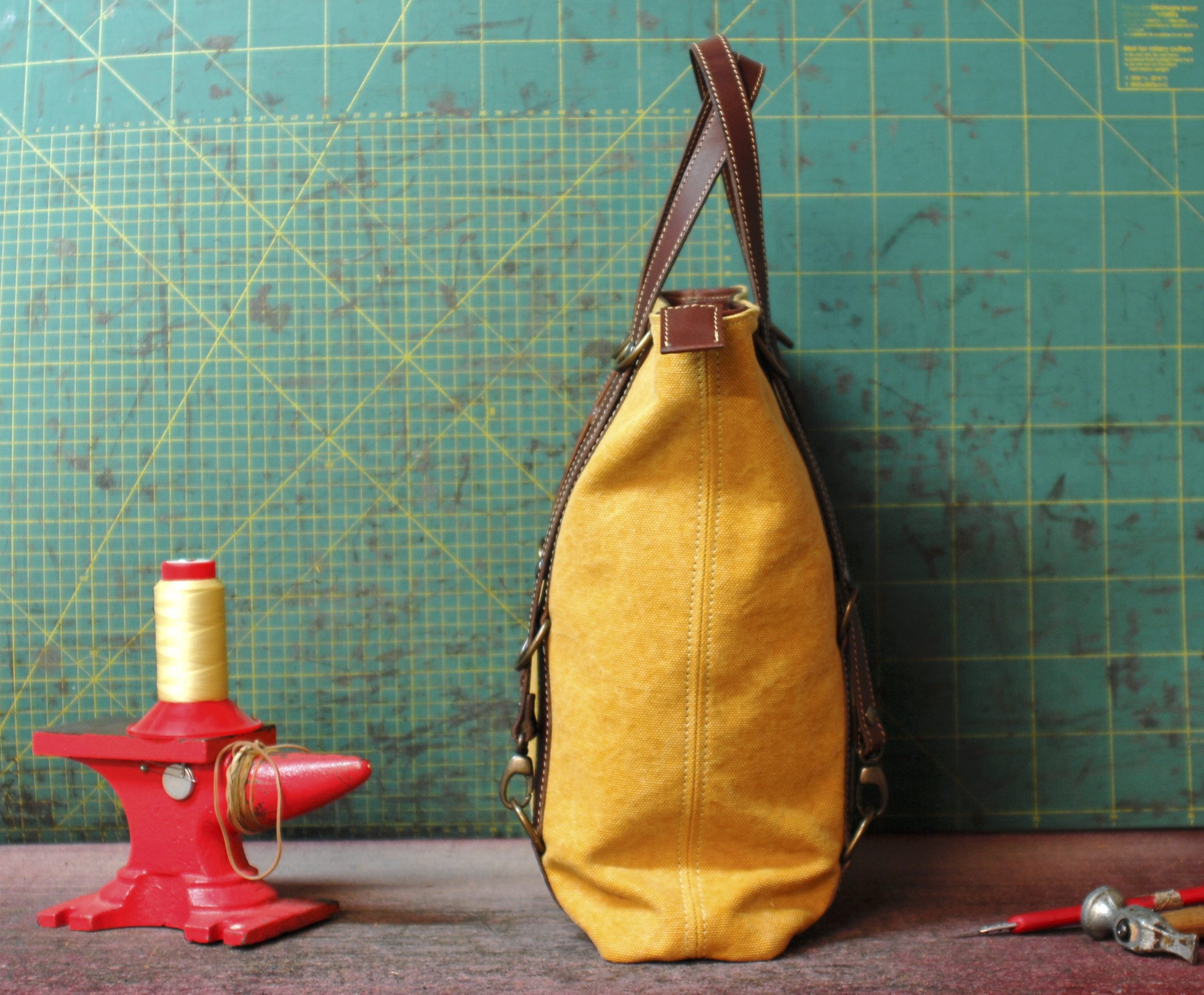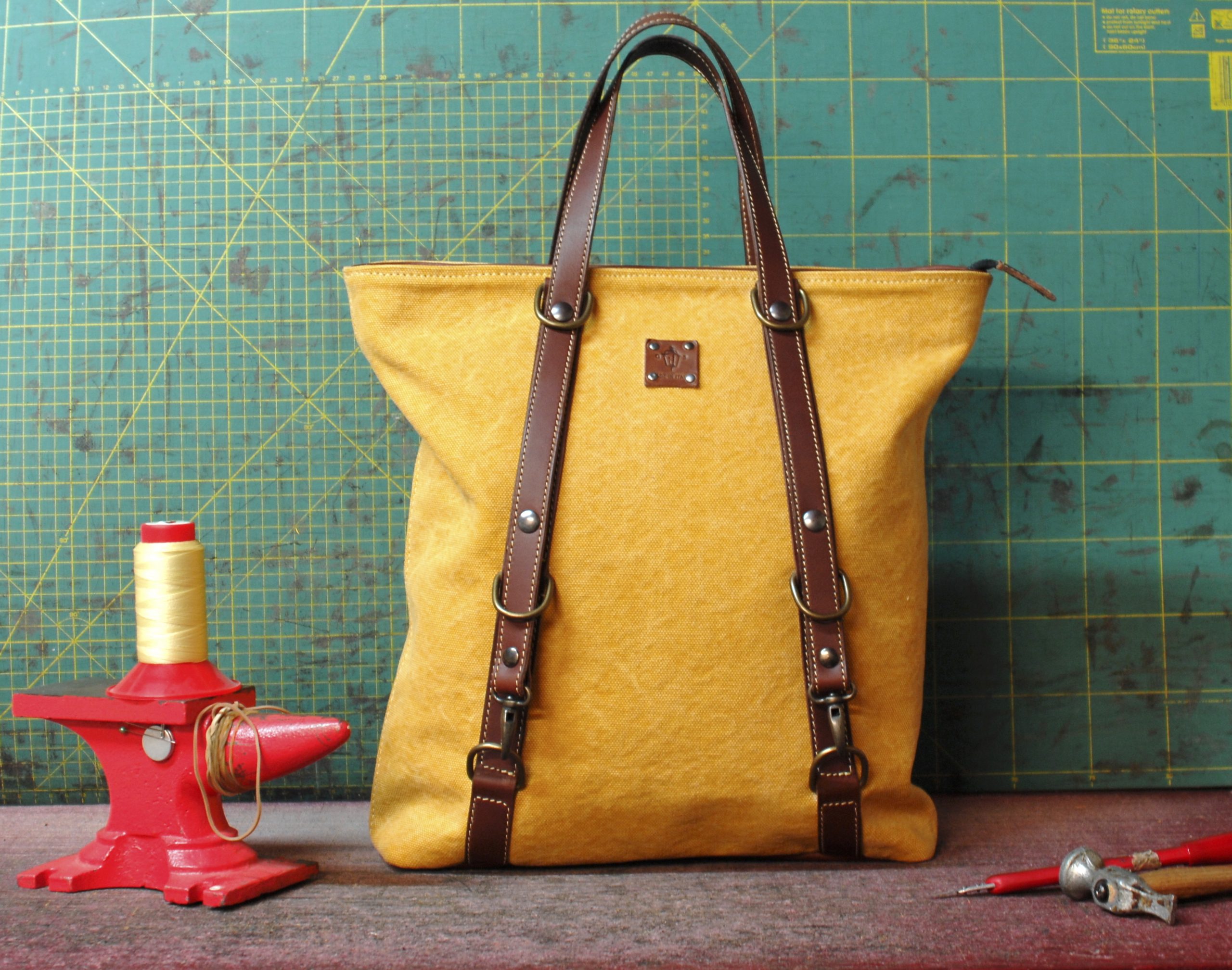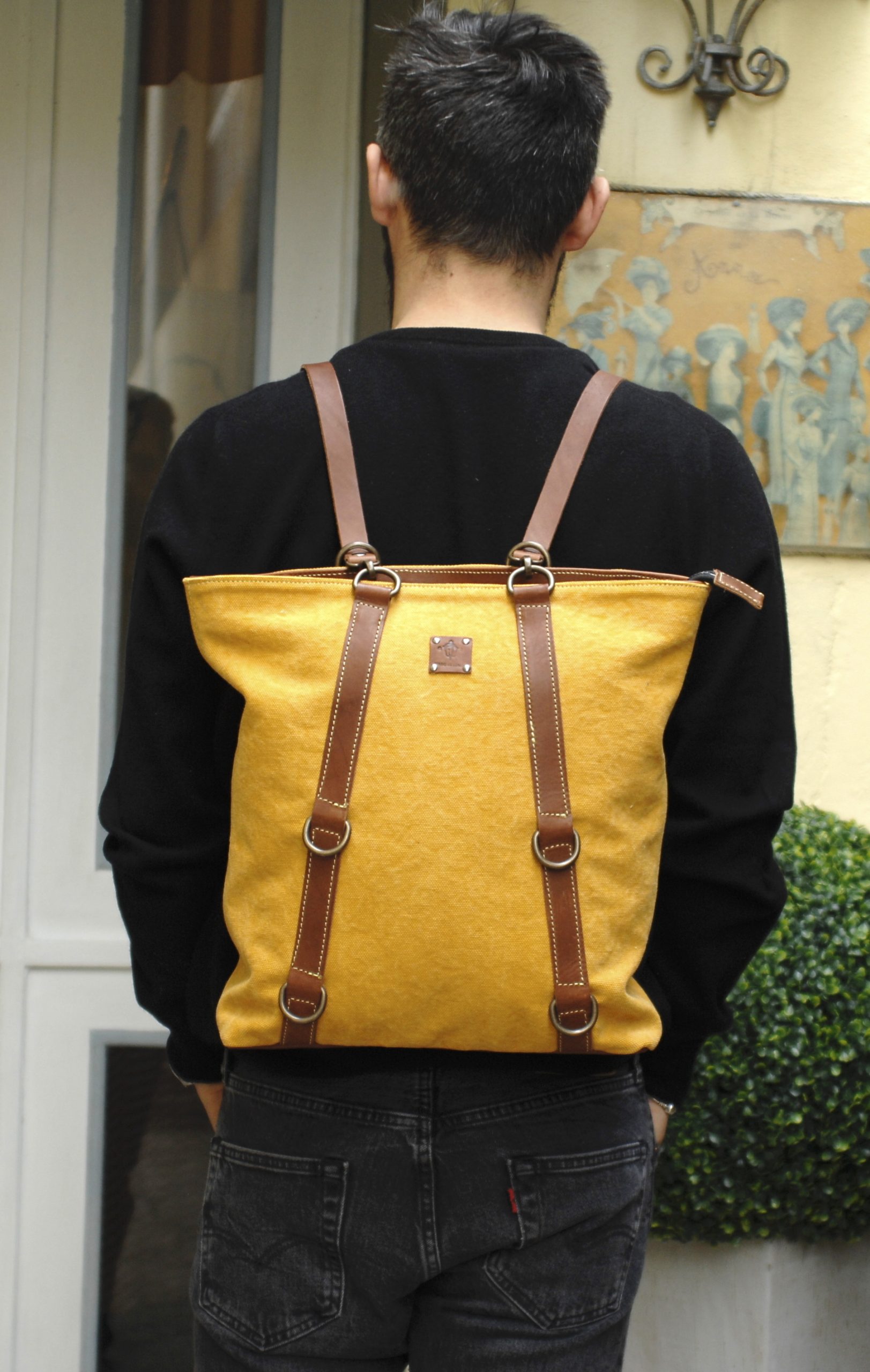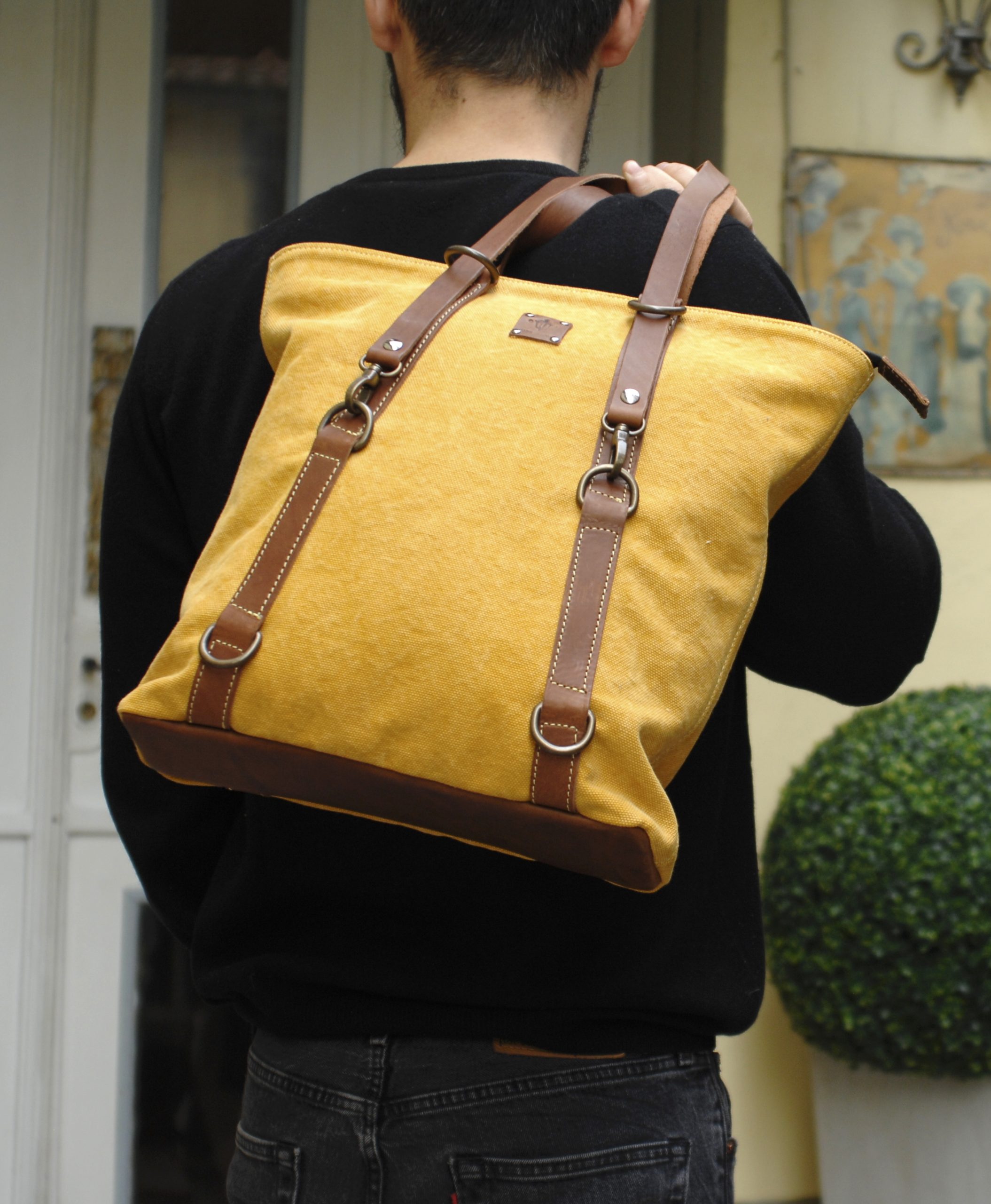 Borsa tribag in tela olona giallo ocra e rifiniture in vacchetta.